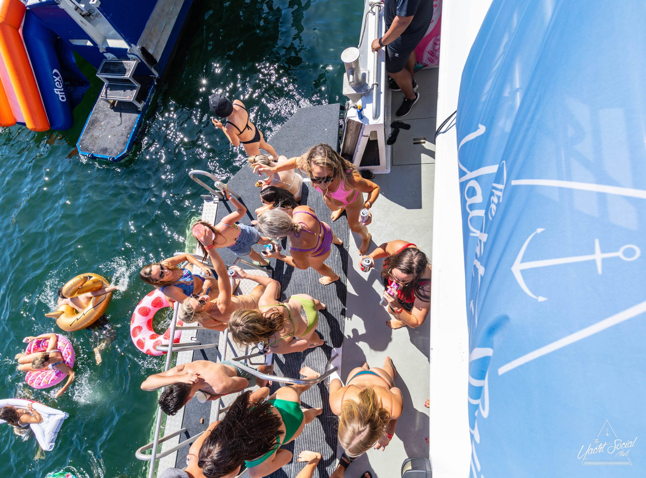 A group of people in swimwear socialize and swim near a docked boat on a sunny day. Various inflatable floaties are in the water, perfect for a lively Catamaran party Sydney. The side of the boat displays a logo with an anchor and text.