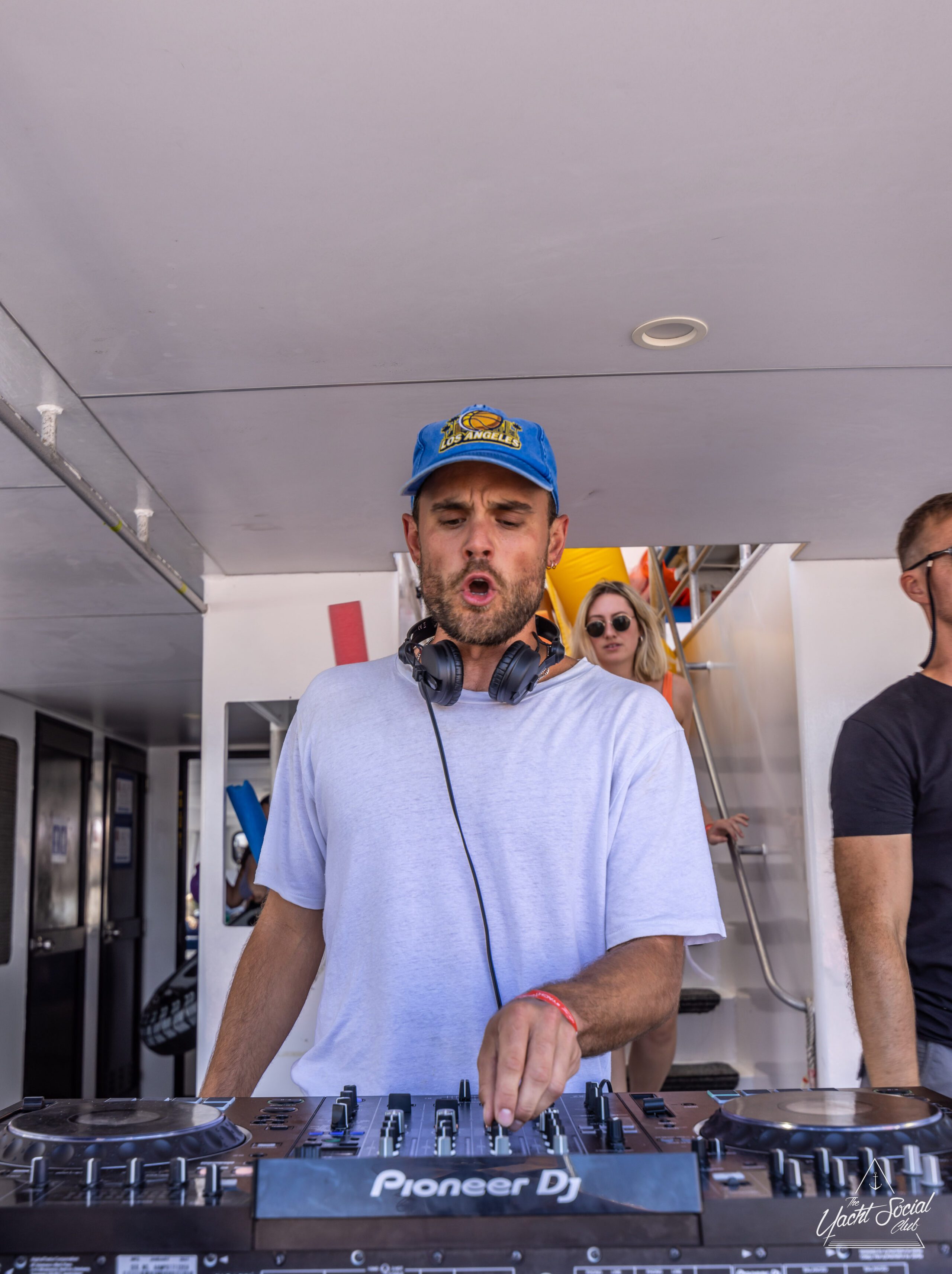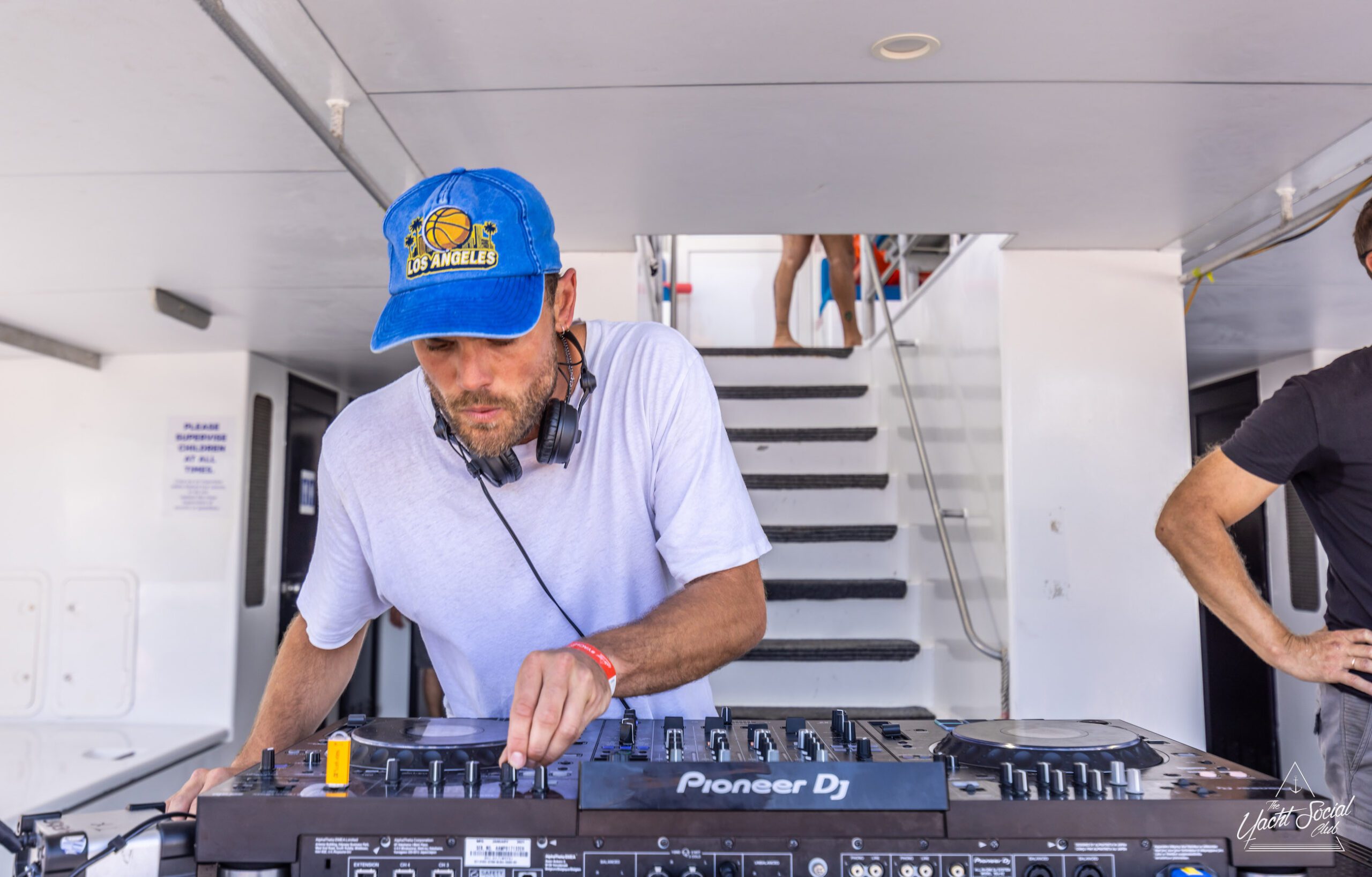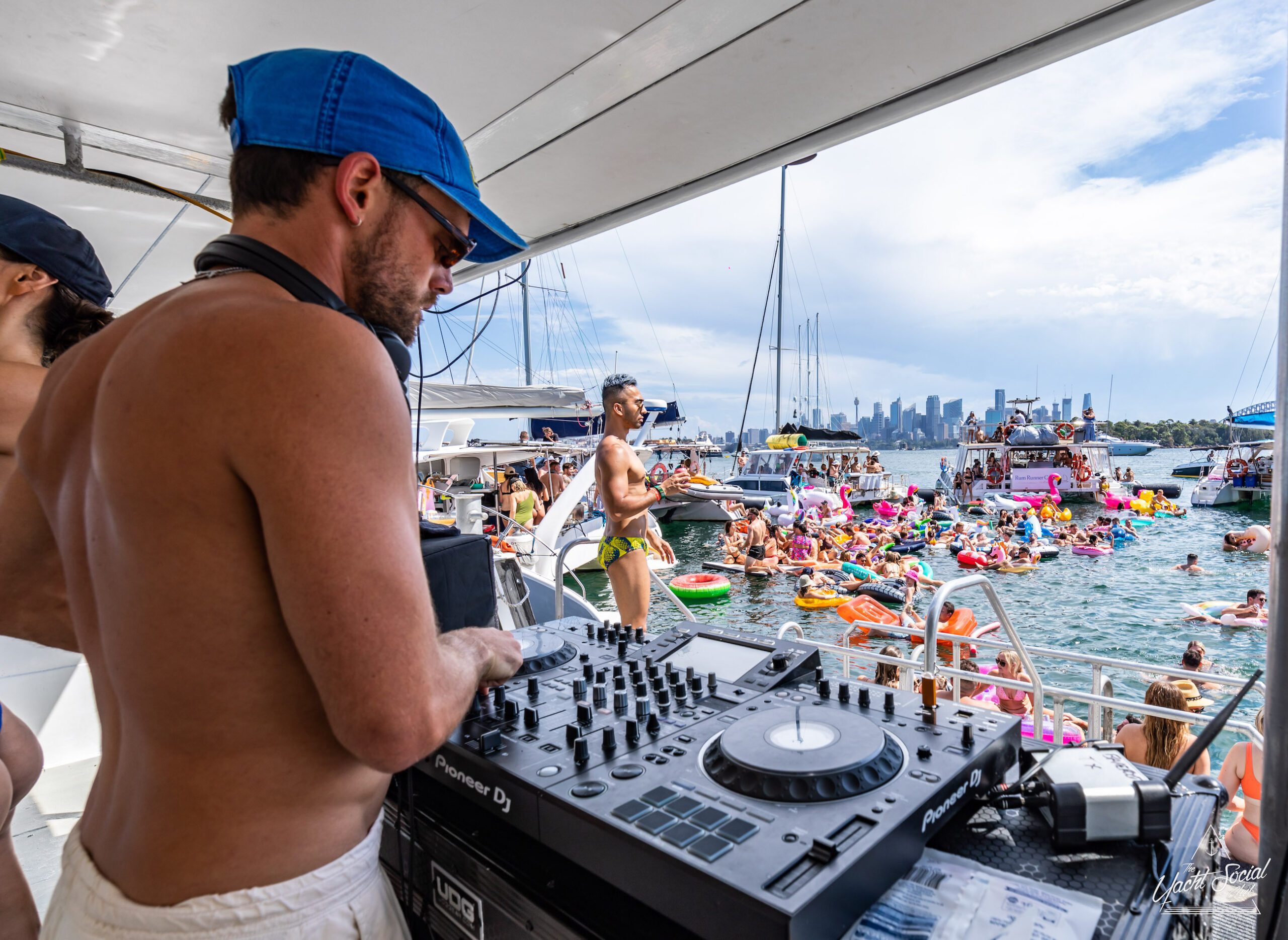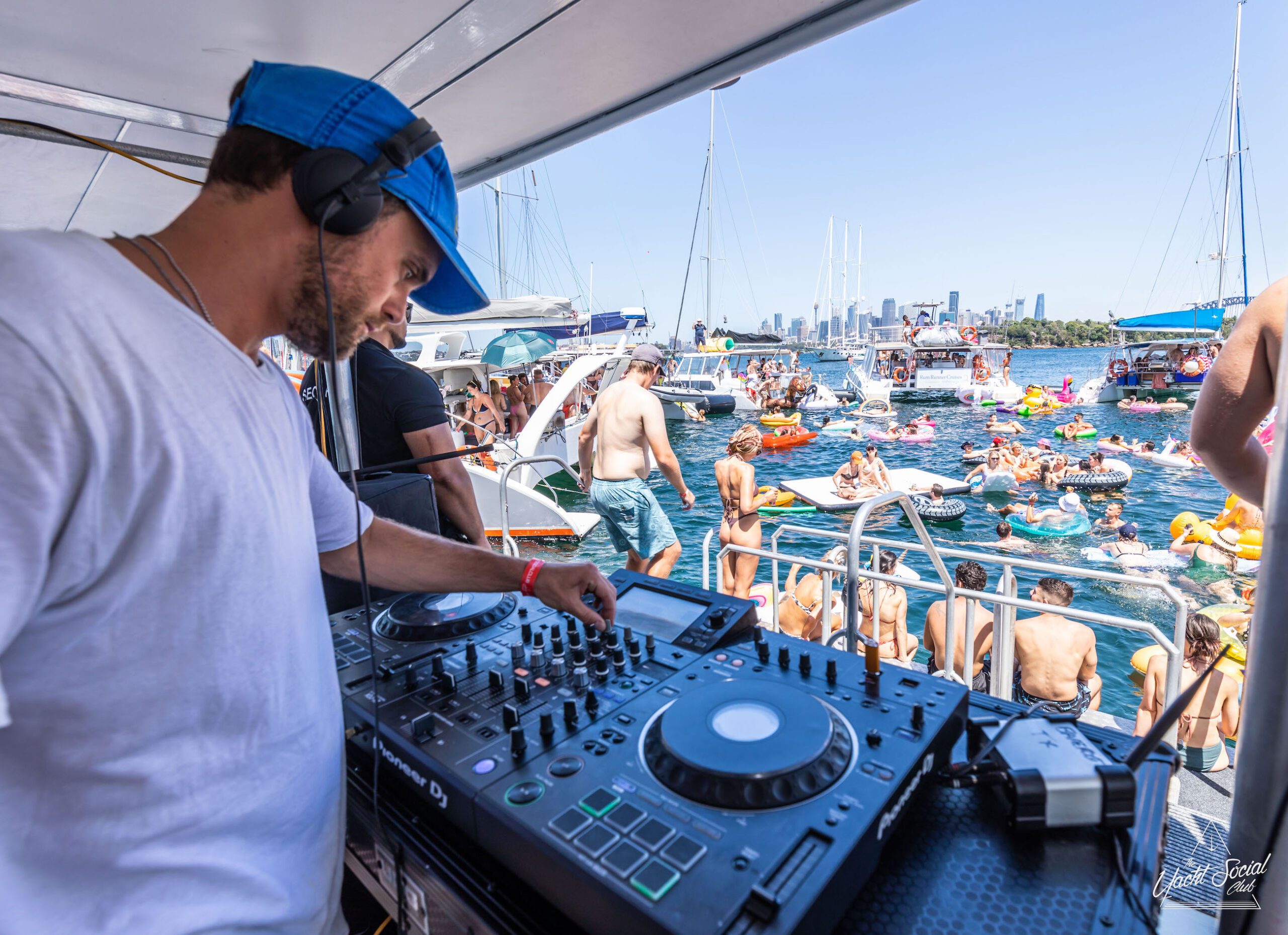 A DJ wearing a blue cap and white T-shirt mixes music on a Pioneer DJ controller aboard a catamaran party in Sydney.
