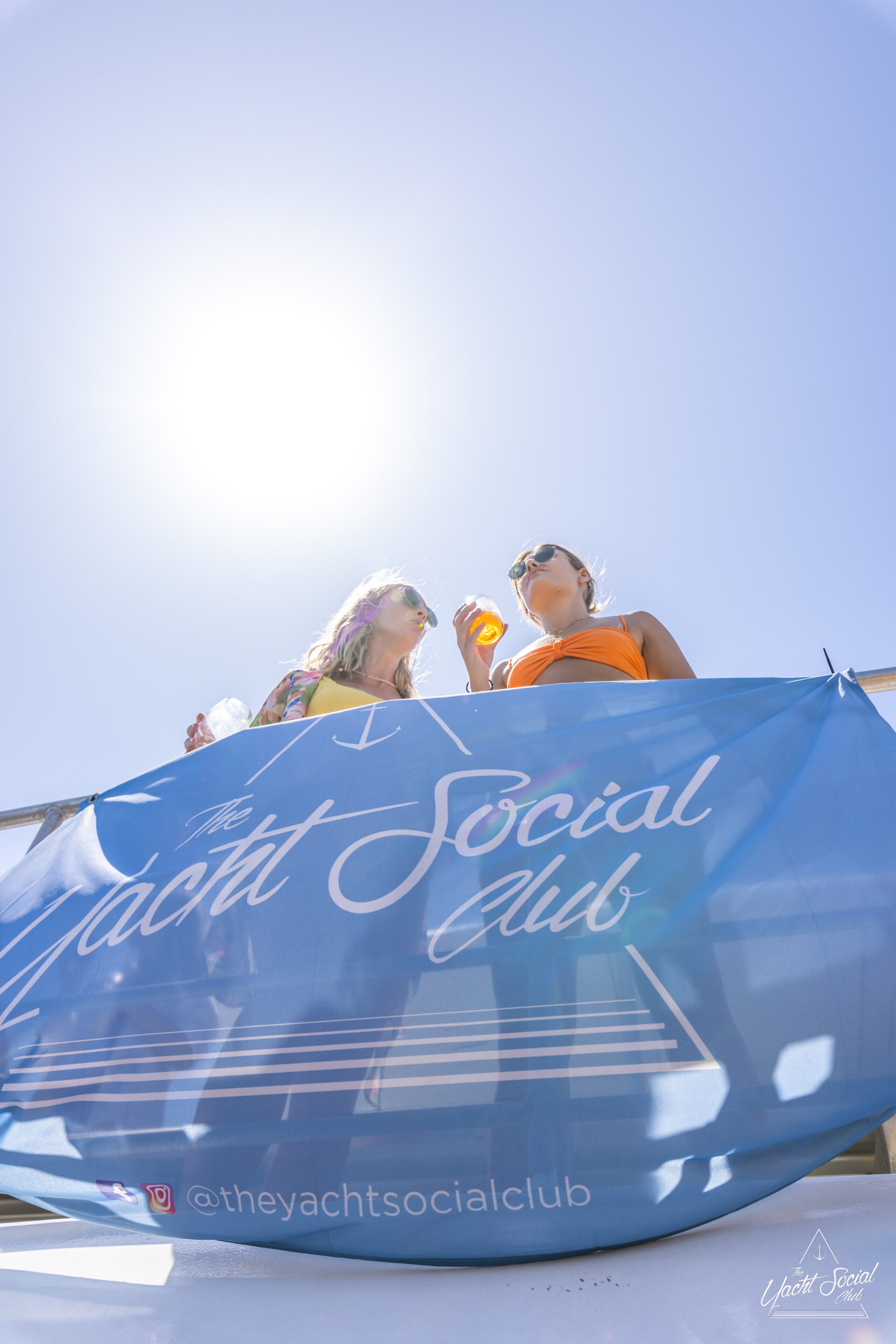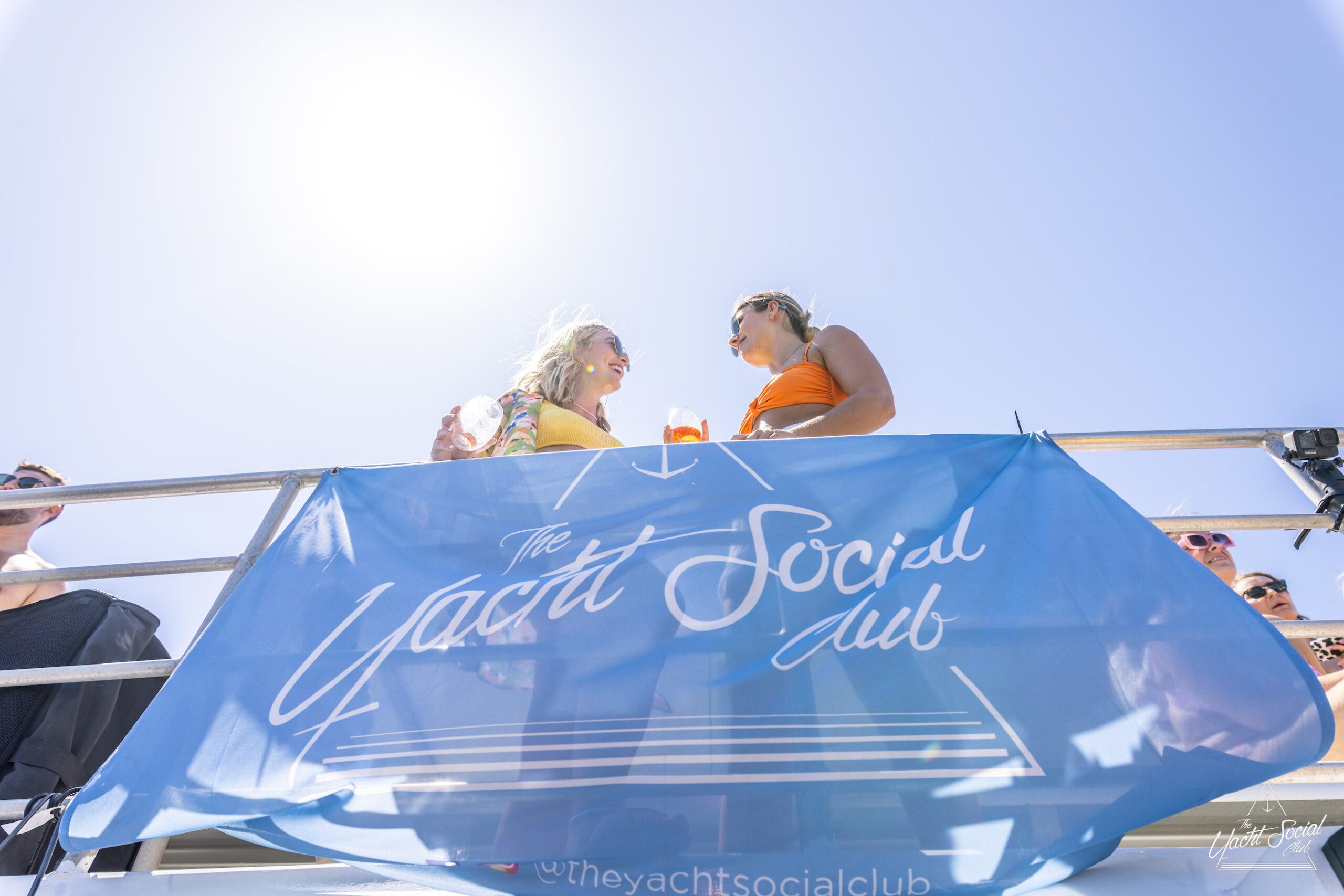 Two people stand on a luxury yacht hire Sydney with a banner reading "The Yacht Social Club" draped over the railing, under a bright blue sky.