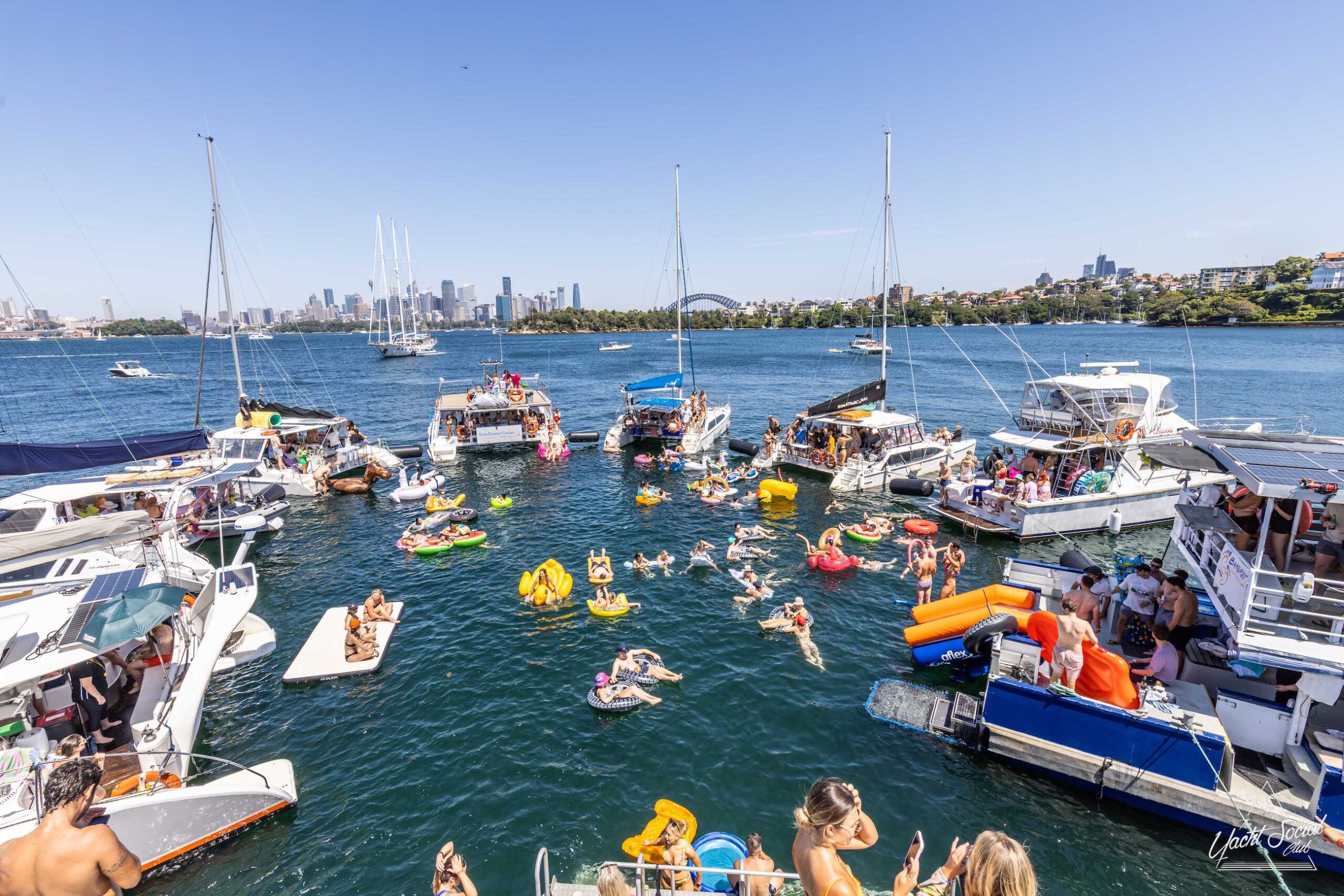 A group of boats, including a festive catamaran party Sydney, are anchored close together in a bay. Many people swim, lounge on inflatables, and socialize in the water and on the boats. The city skyline is visible in the background.