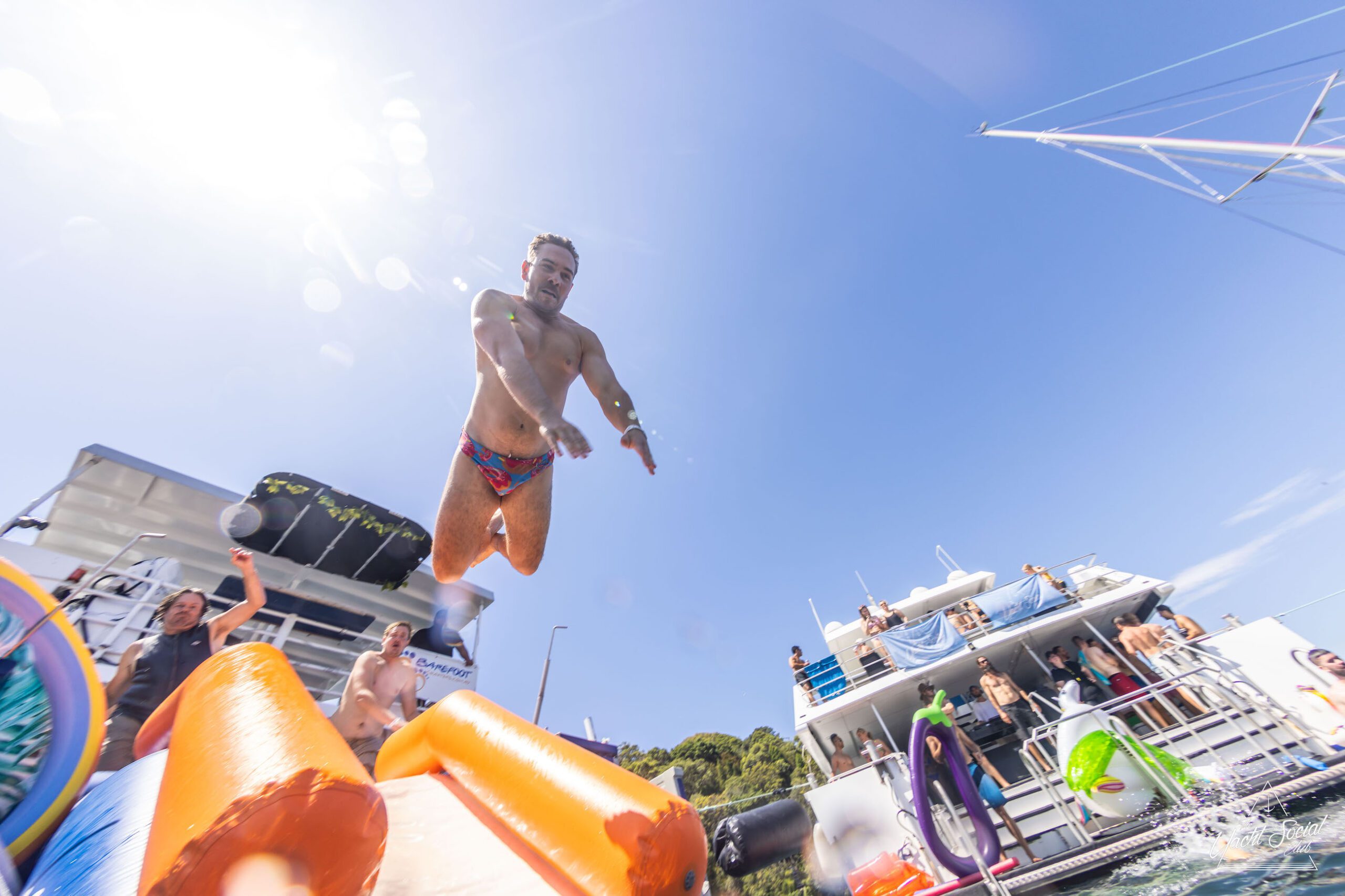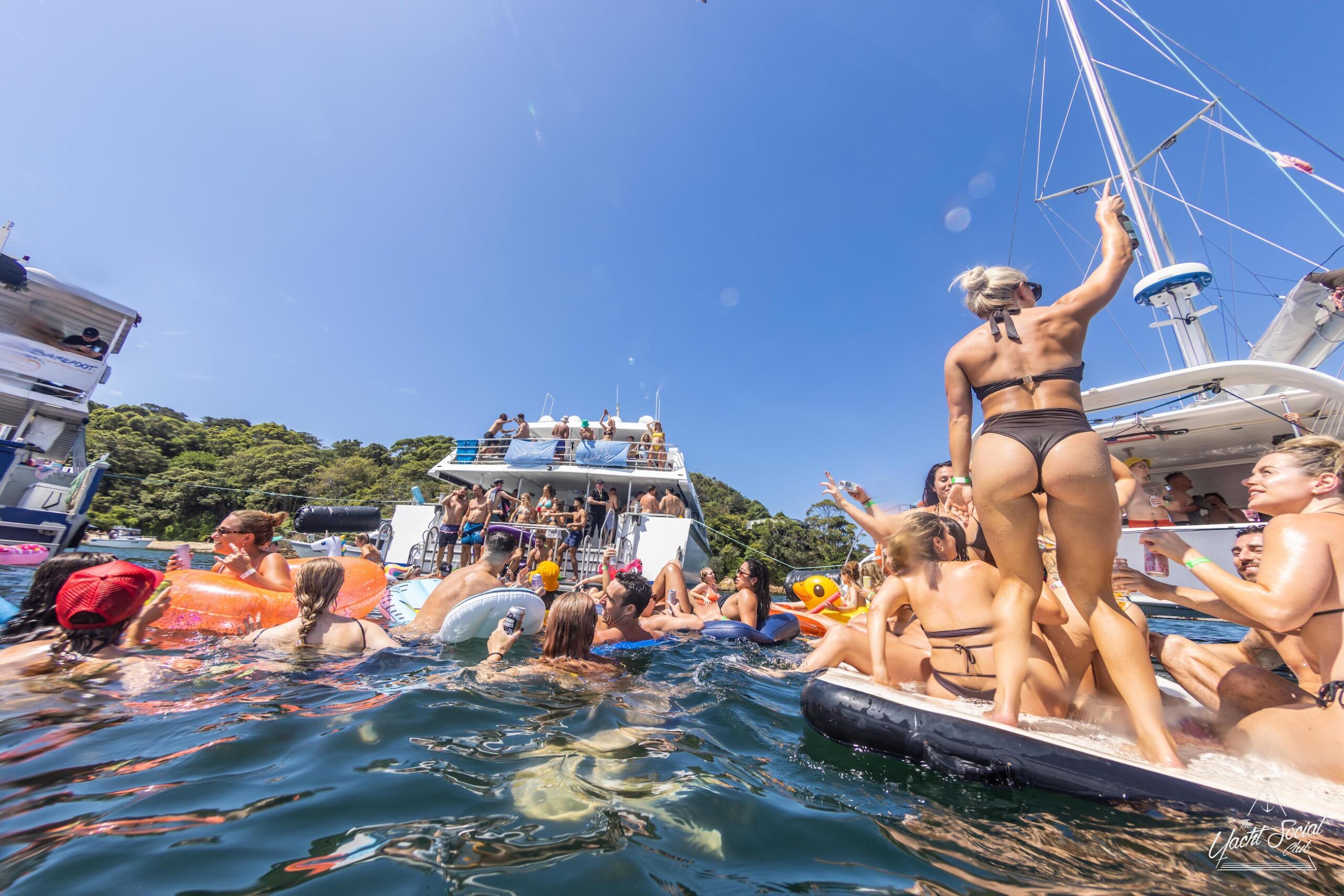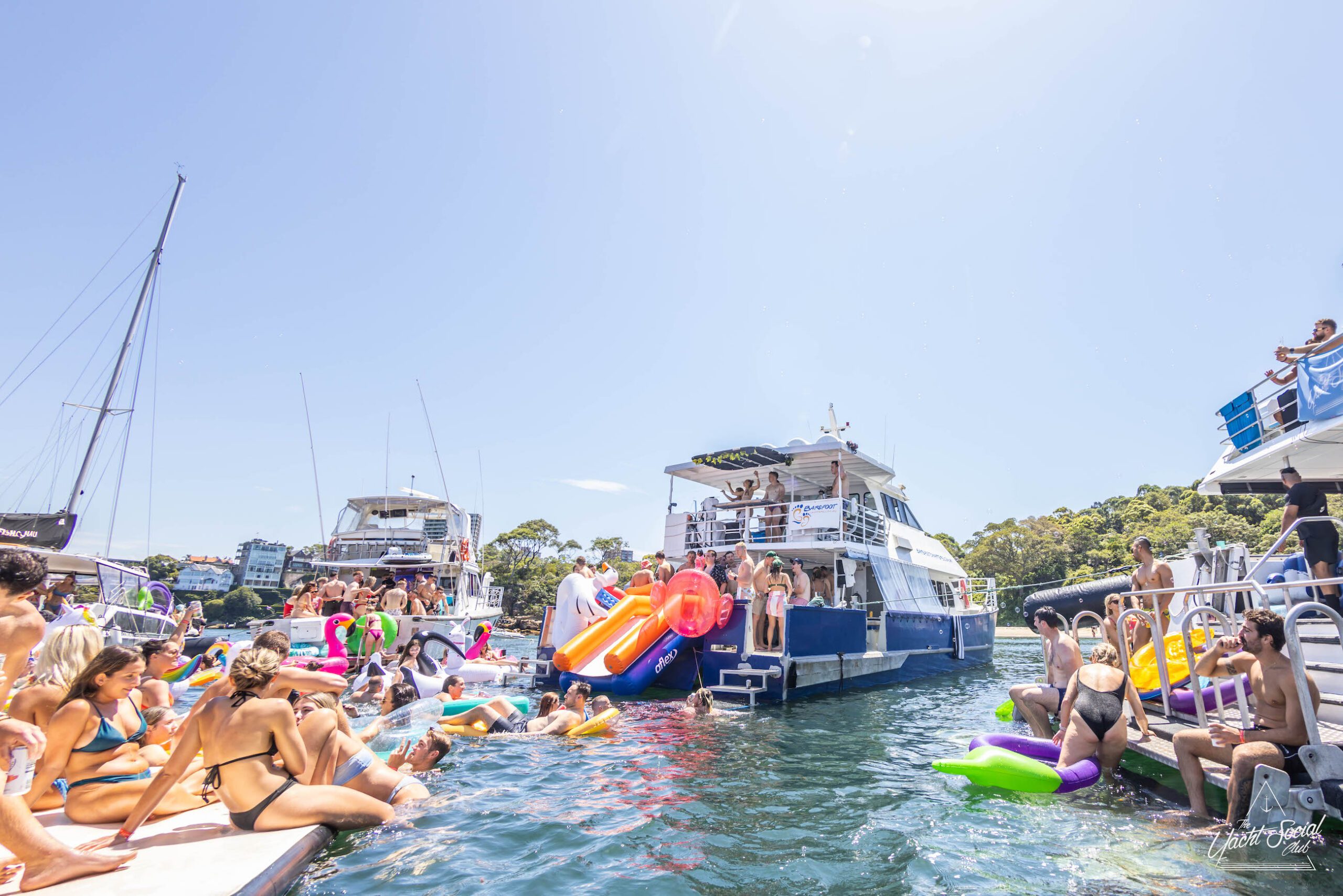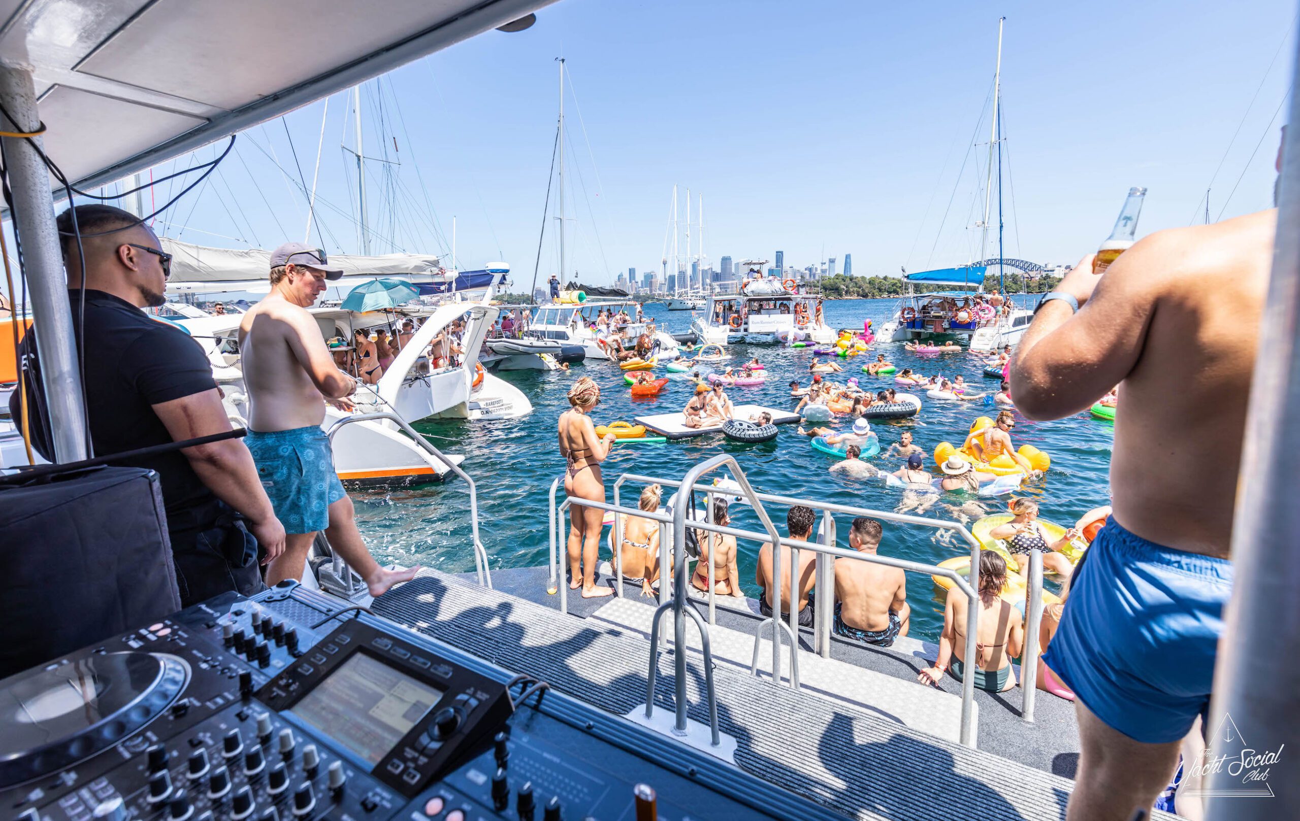 People enjoying a sunny day at a catamaran party in Sydney, swimming, and lounging on inflatables in the water, with DJs playing music on a nearby boat.