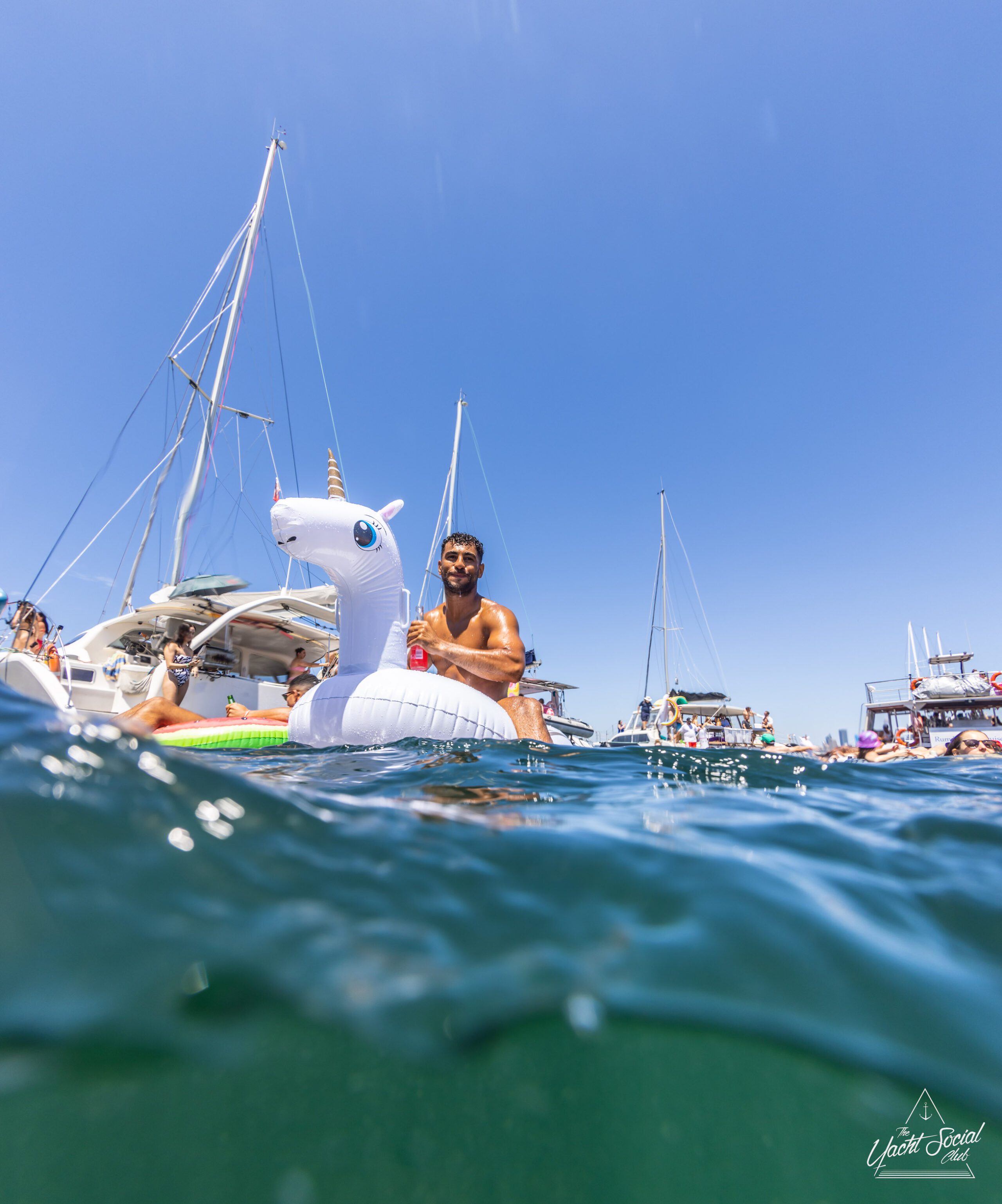 A man on a unicorn float in the water, surrounded by boats under a clear blue sky, enjoying the ambiance of luxury yacht hire Sydney.