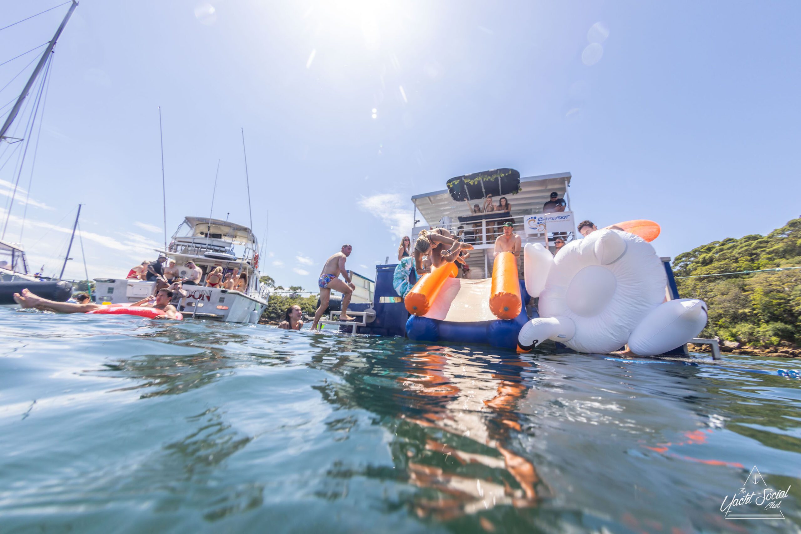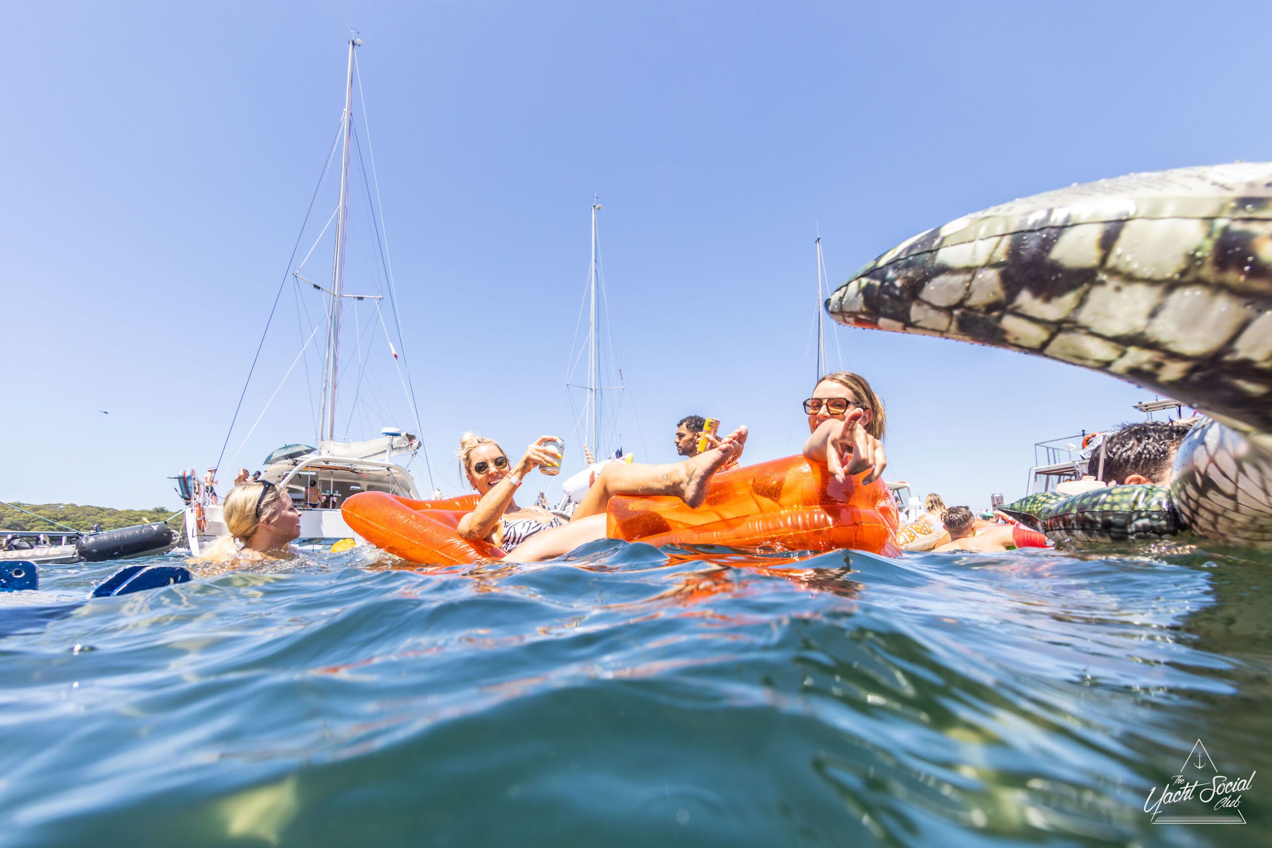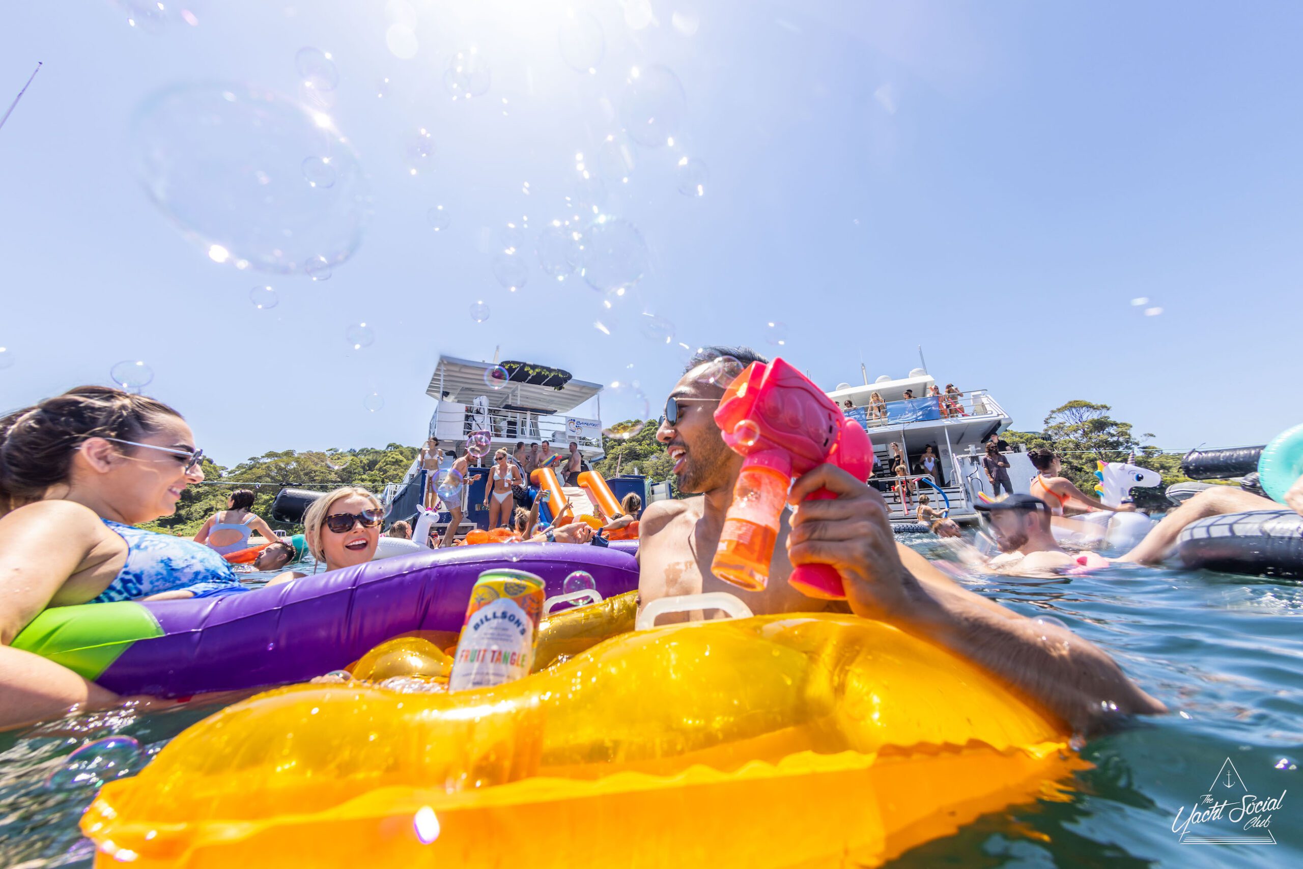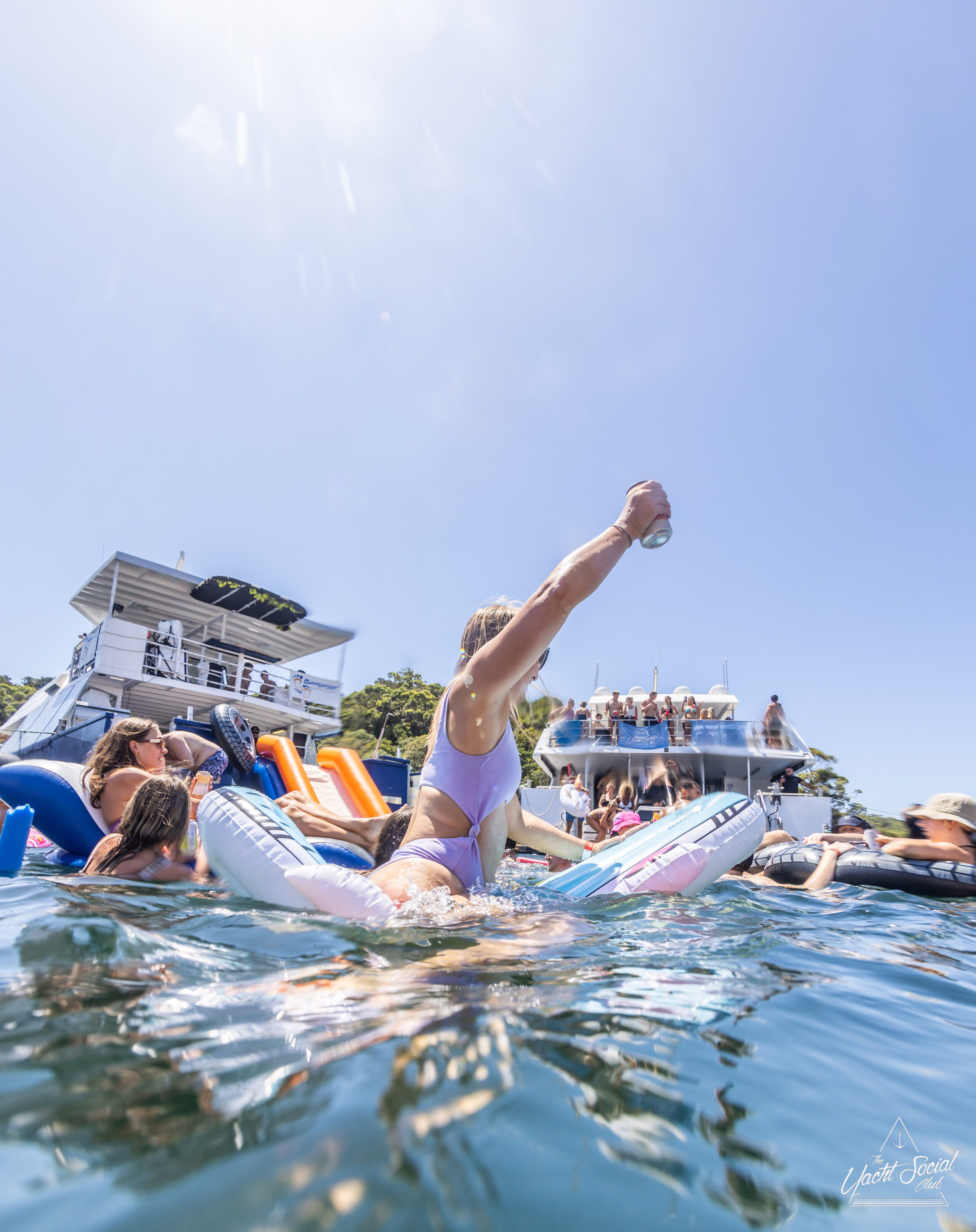 Person on an inflatable raft in the water, holding a can with one arm raised. Several other people are swimming or on floatables nearby. Two boats, including one from a luxury yacht hire Sydney service, are in the background with people on board.