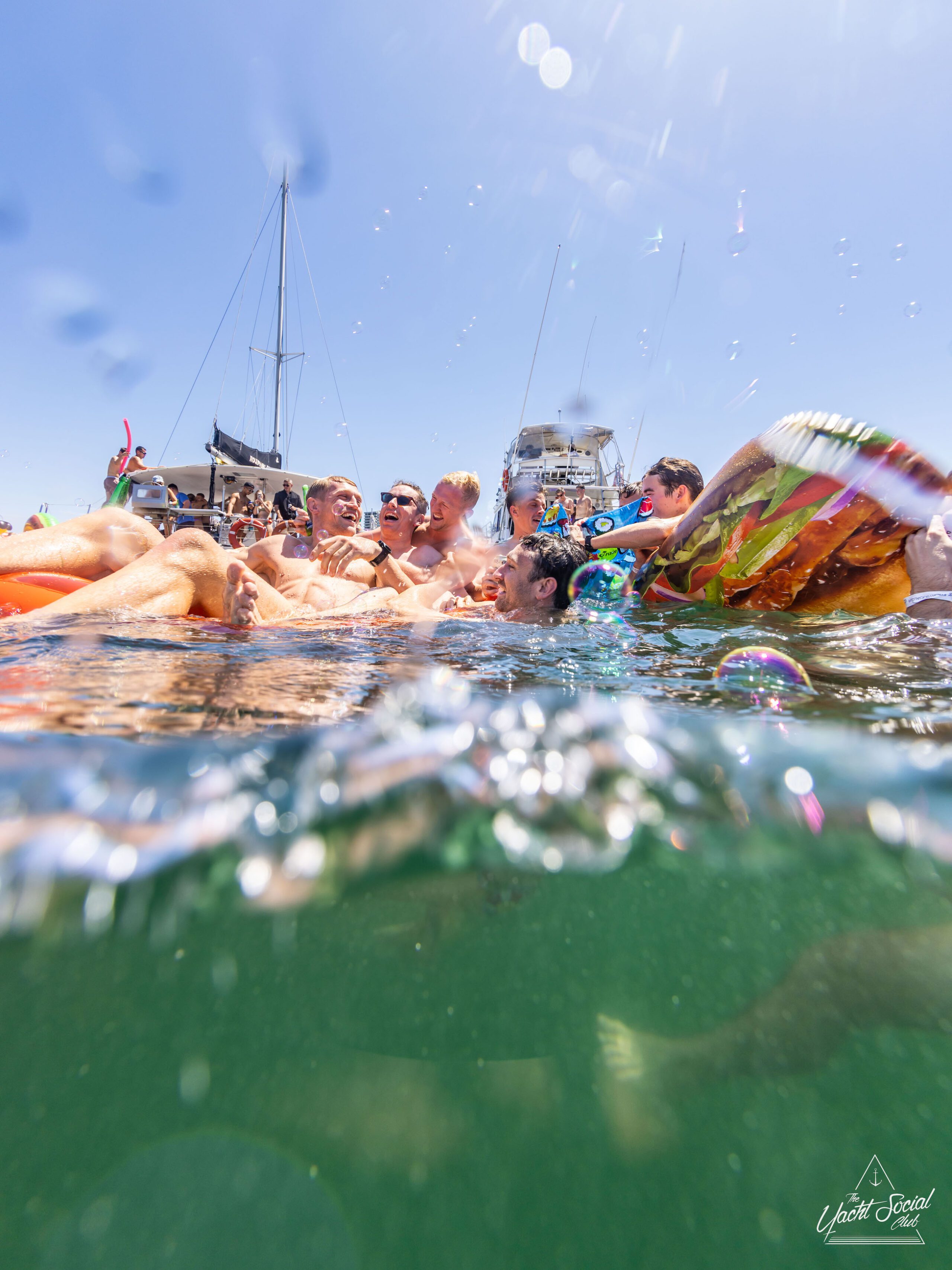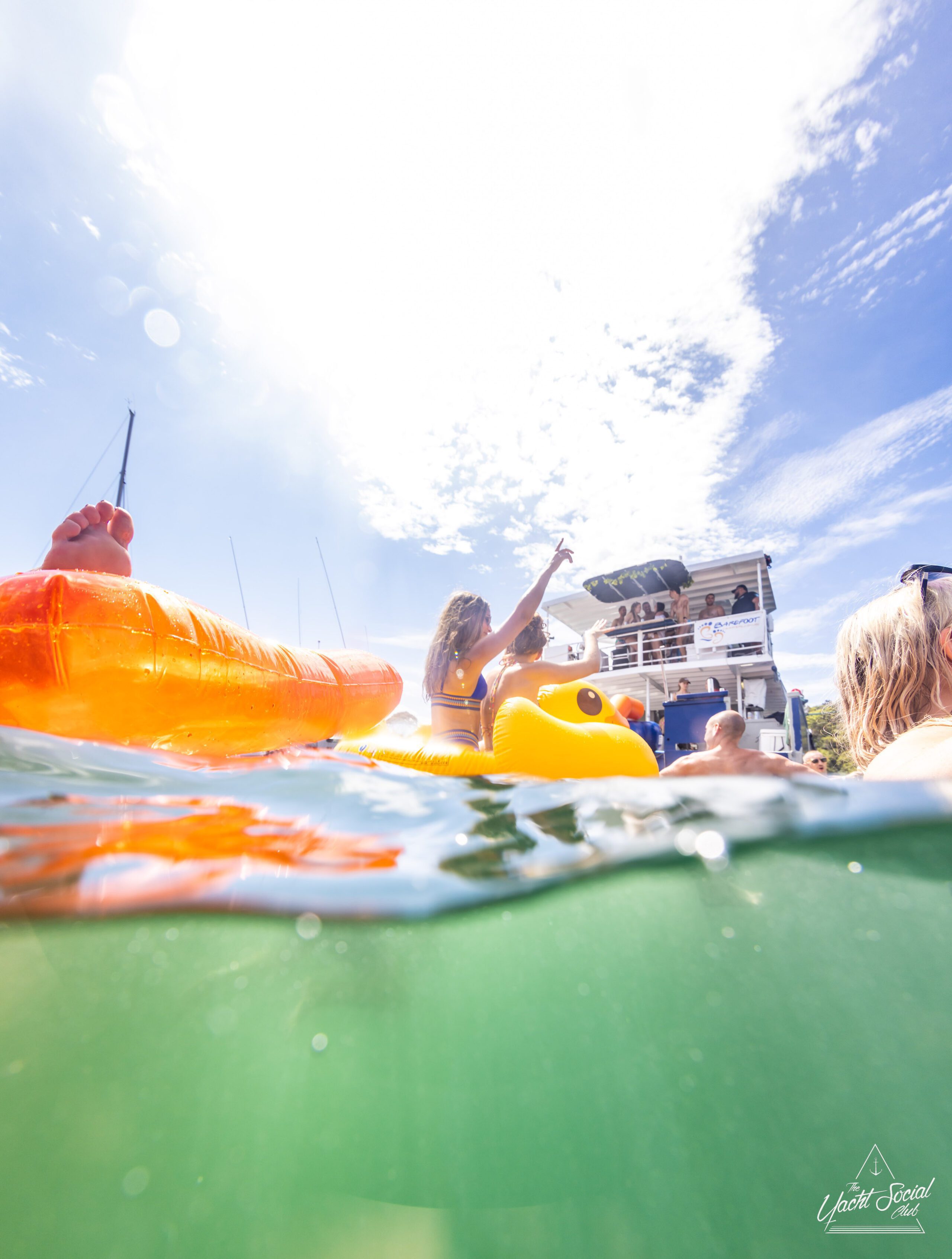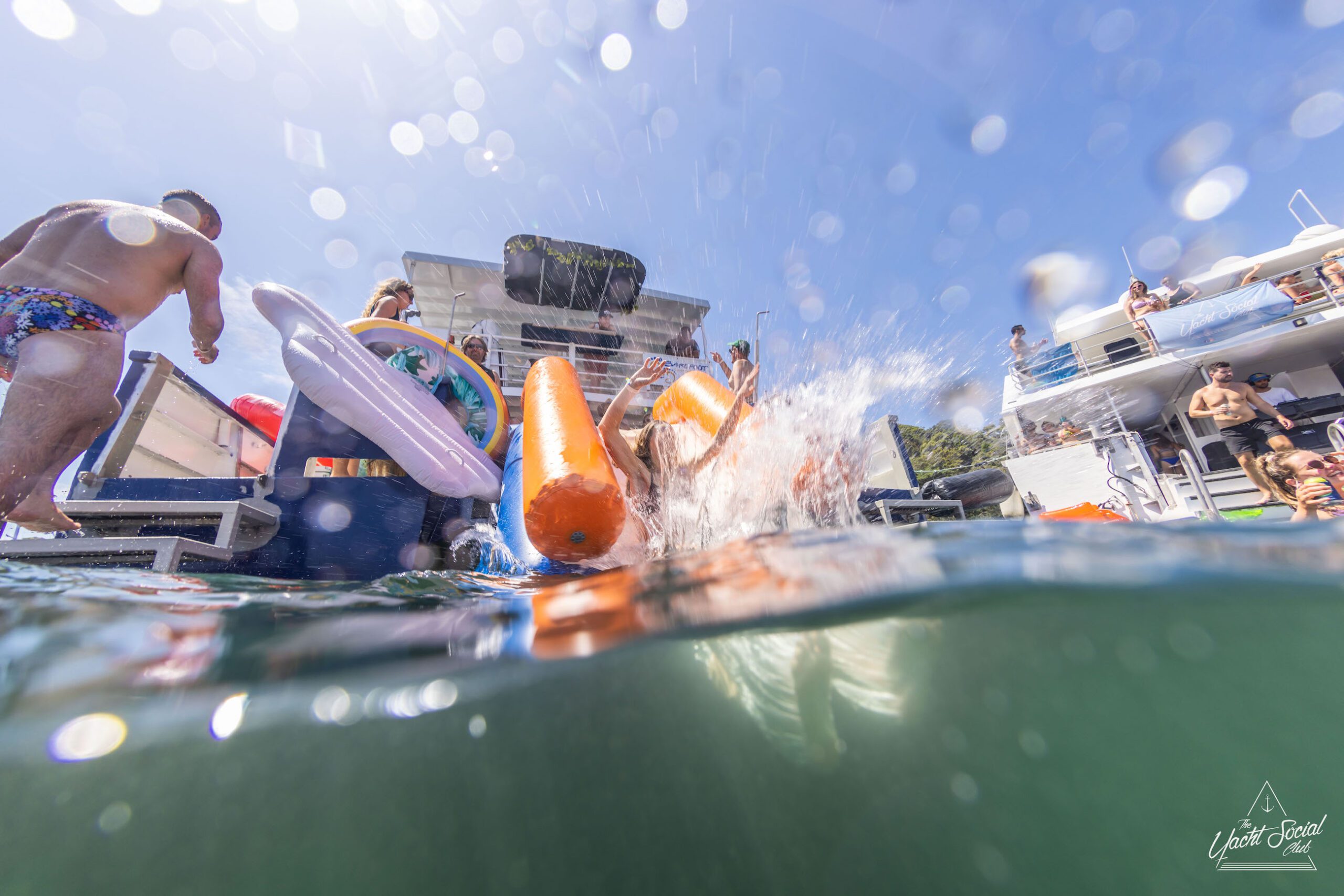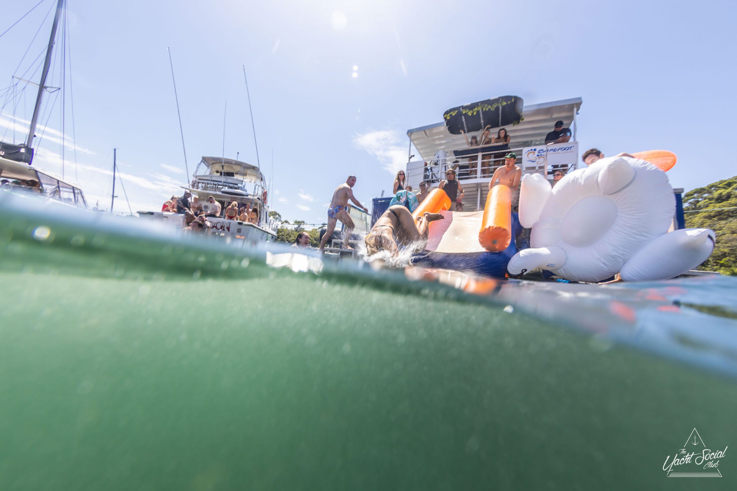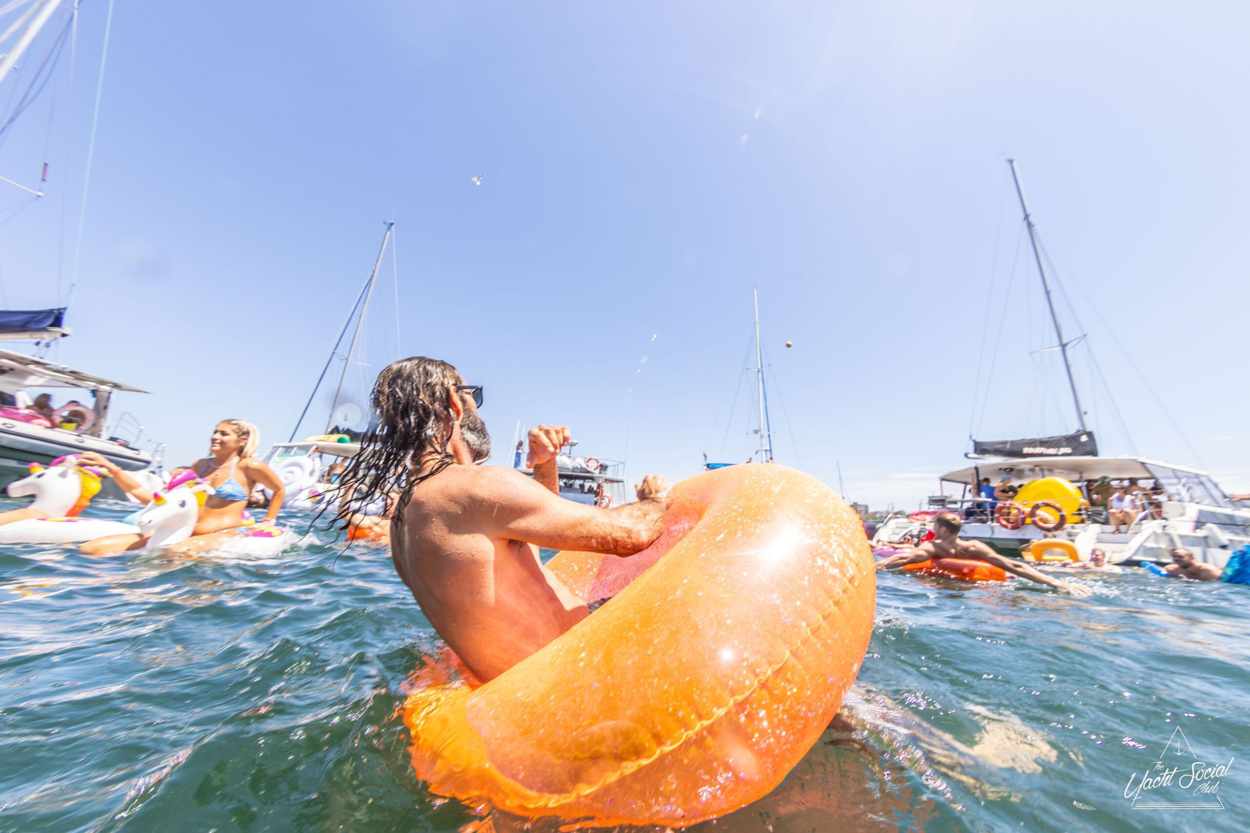 Person on an inflatable raft in the water, holding a can with one arm raised. Several other people are swimming or on floatables nearby. Two boats, including one from a luxury yacht hire Sydney service, are in the background with people on board.