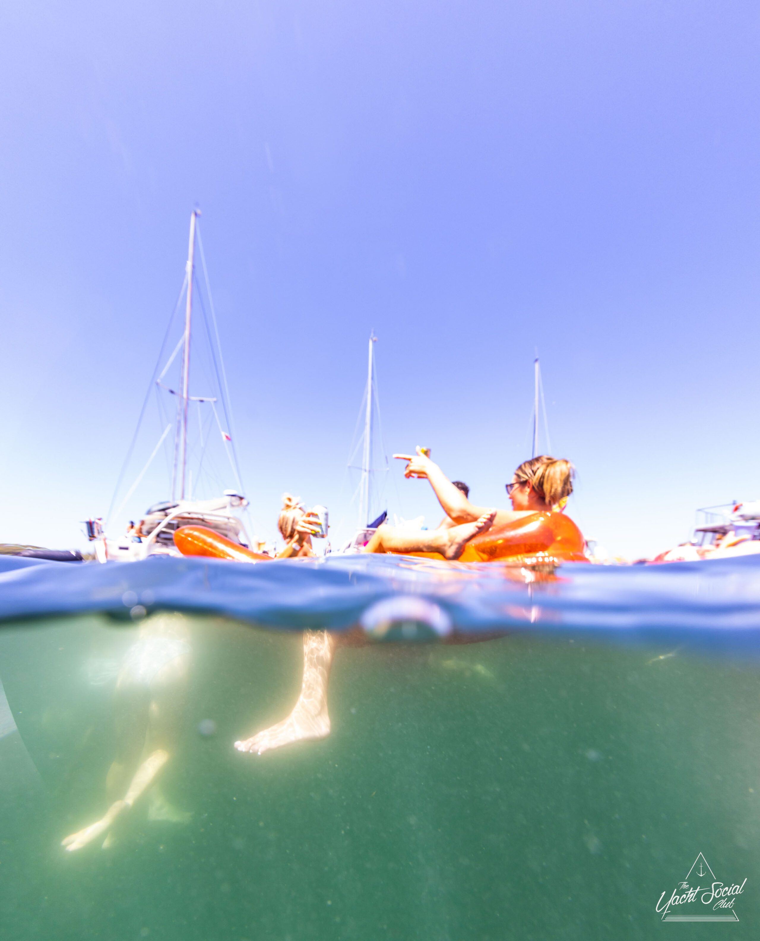 A view of people swimming and lounging on inflatables in the sea, with sailboats and a clear blue sky in the background. The photo is taken half above and half below the water surface, perfect for showcasing a luxury yacht hire Sydney experience.