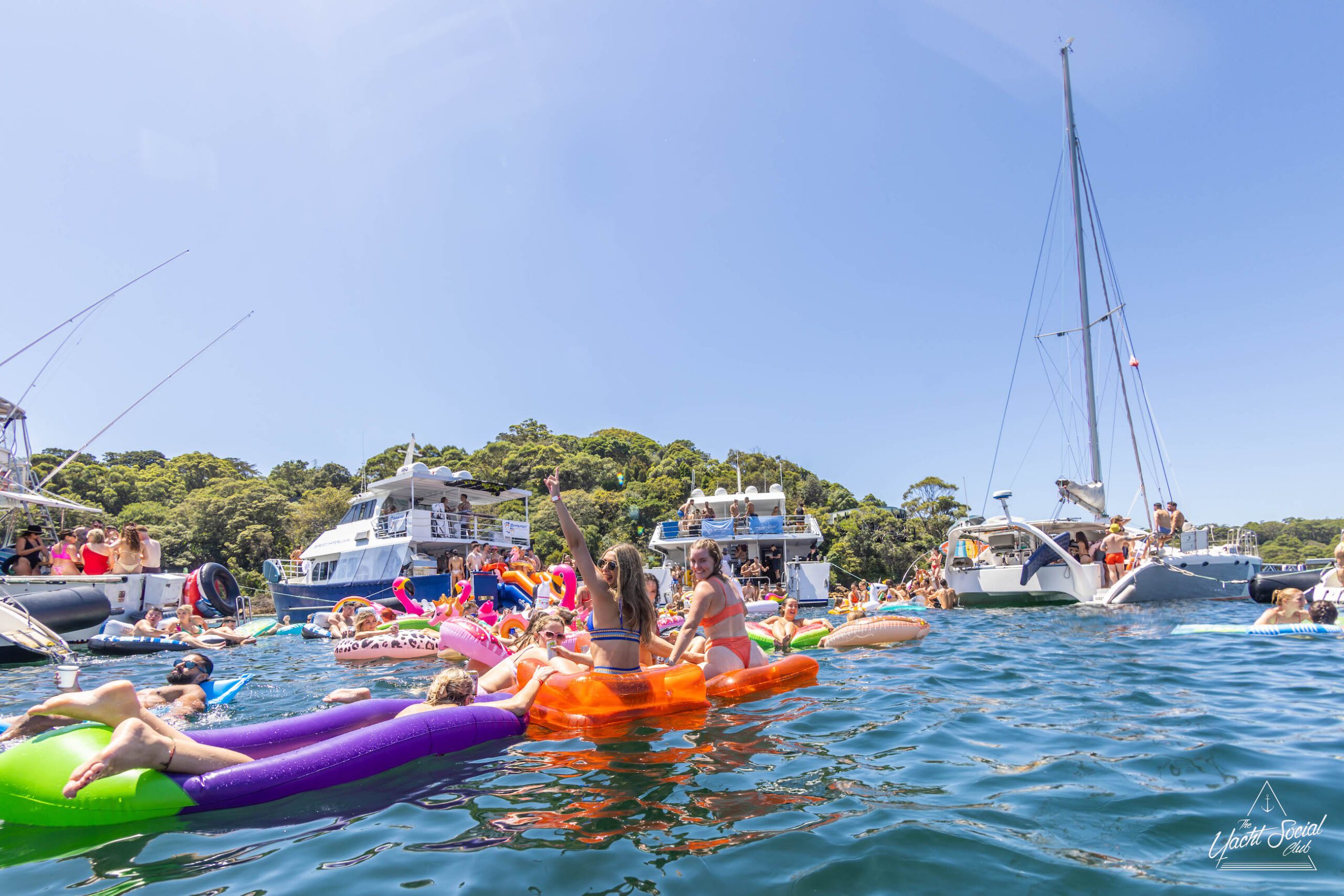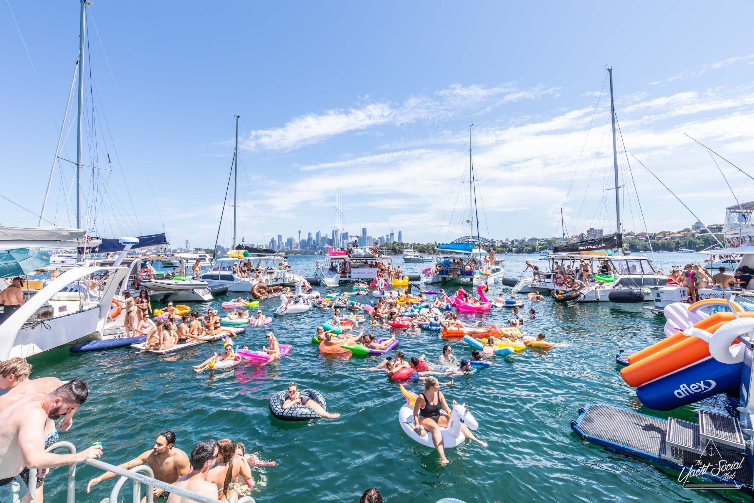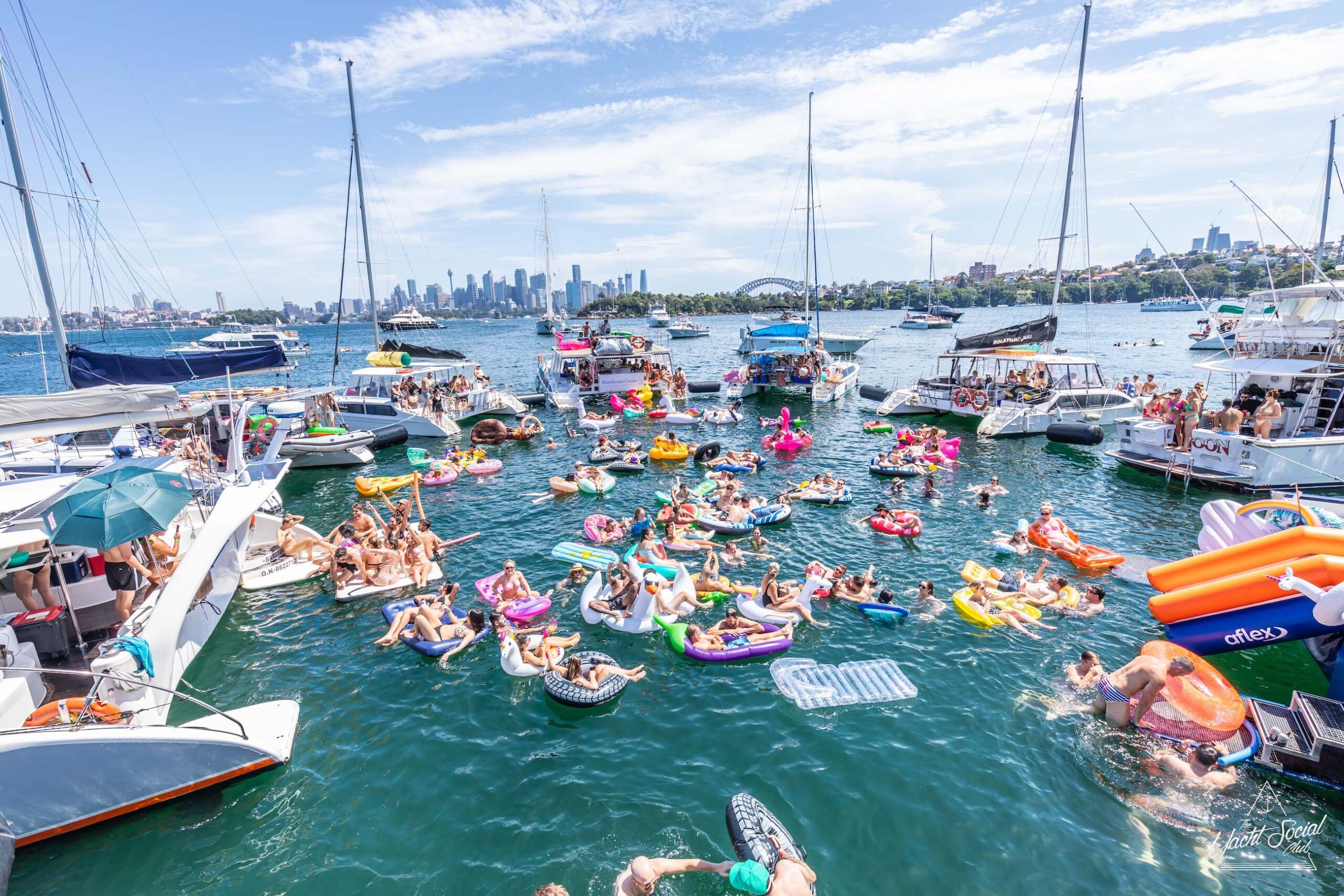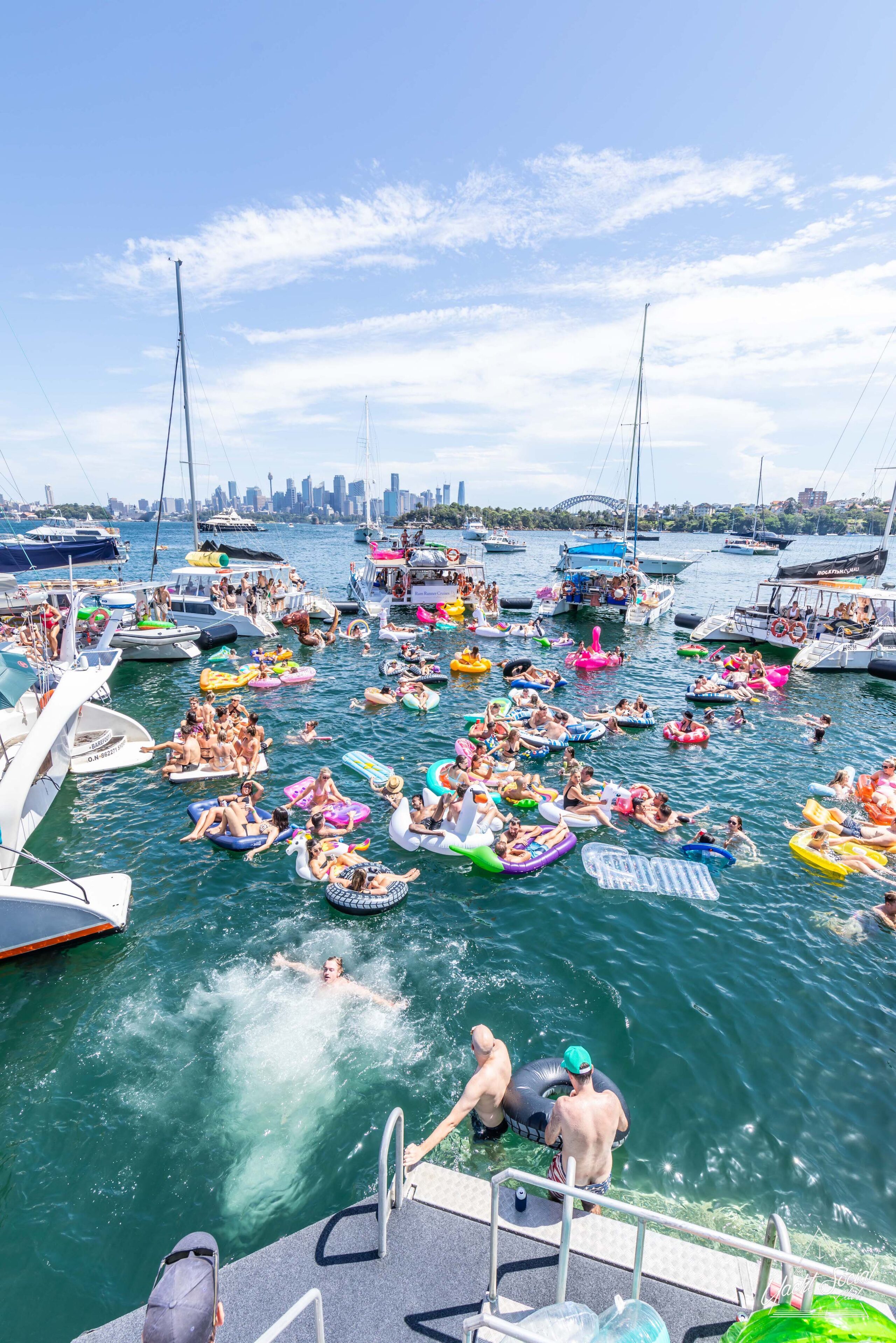 People floating on colorful inflatable pool toys in the water near several boats on a sunny day, enjoying a lively catamaran party in Sydney.
