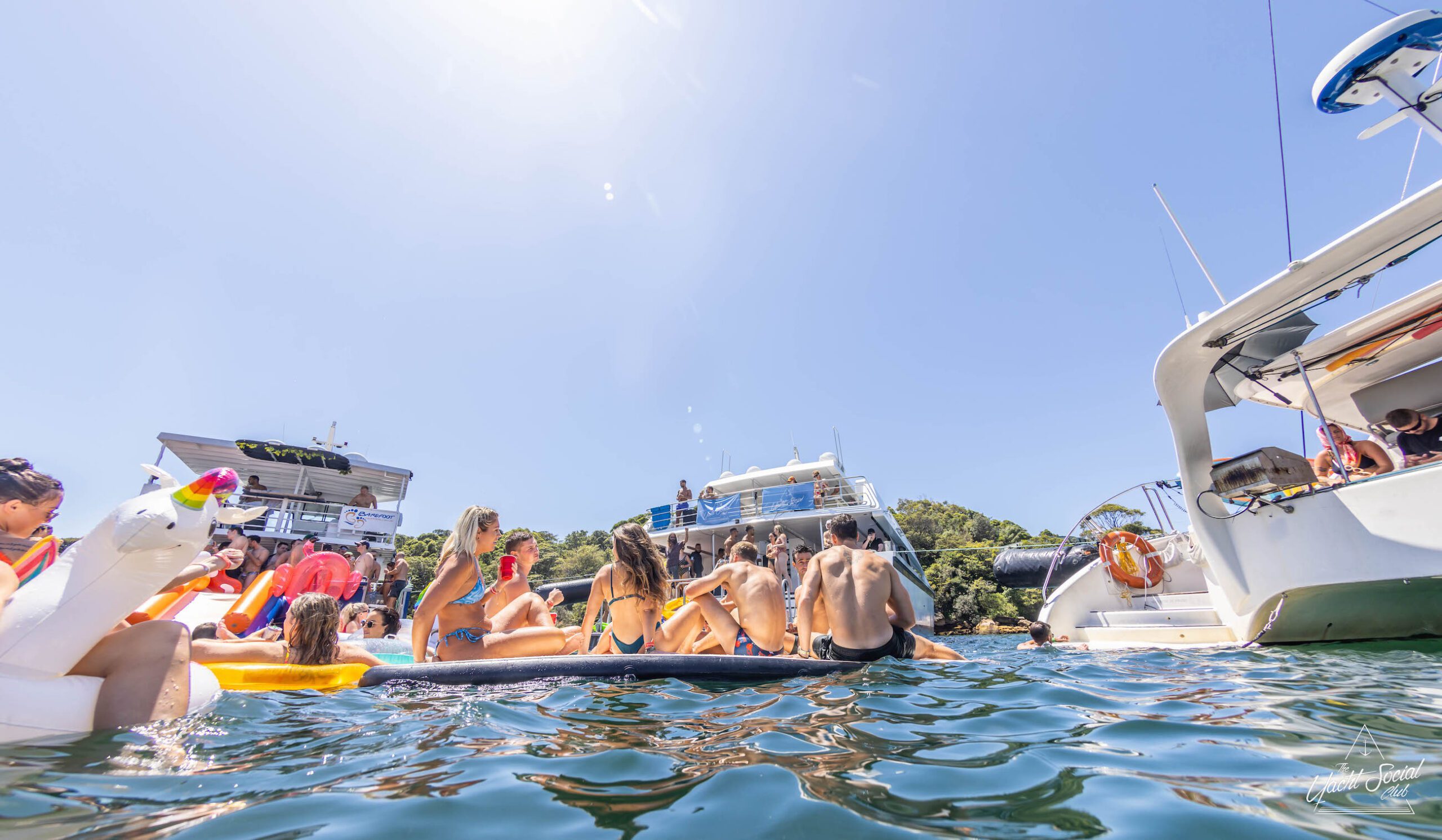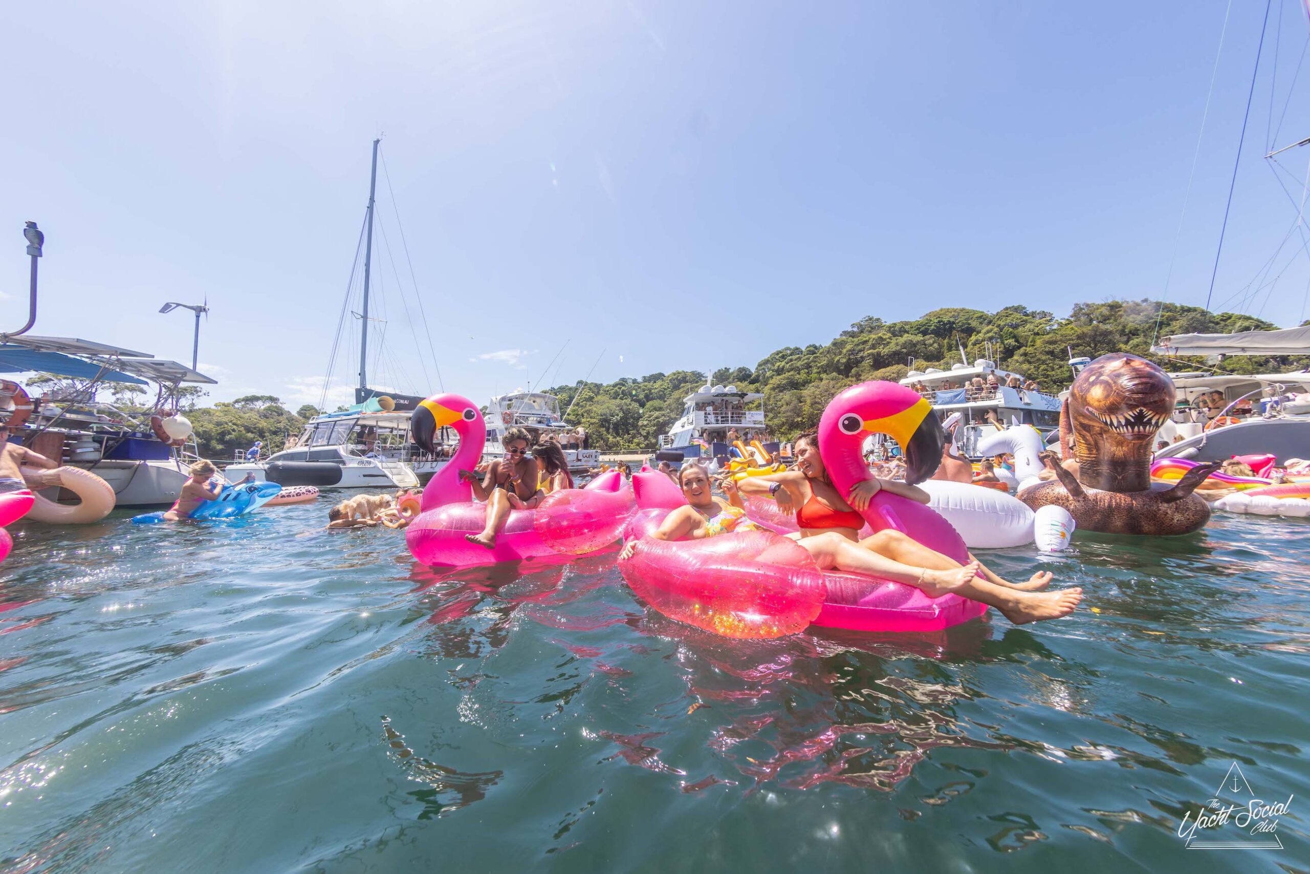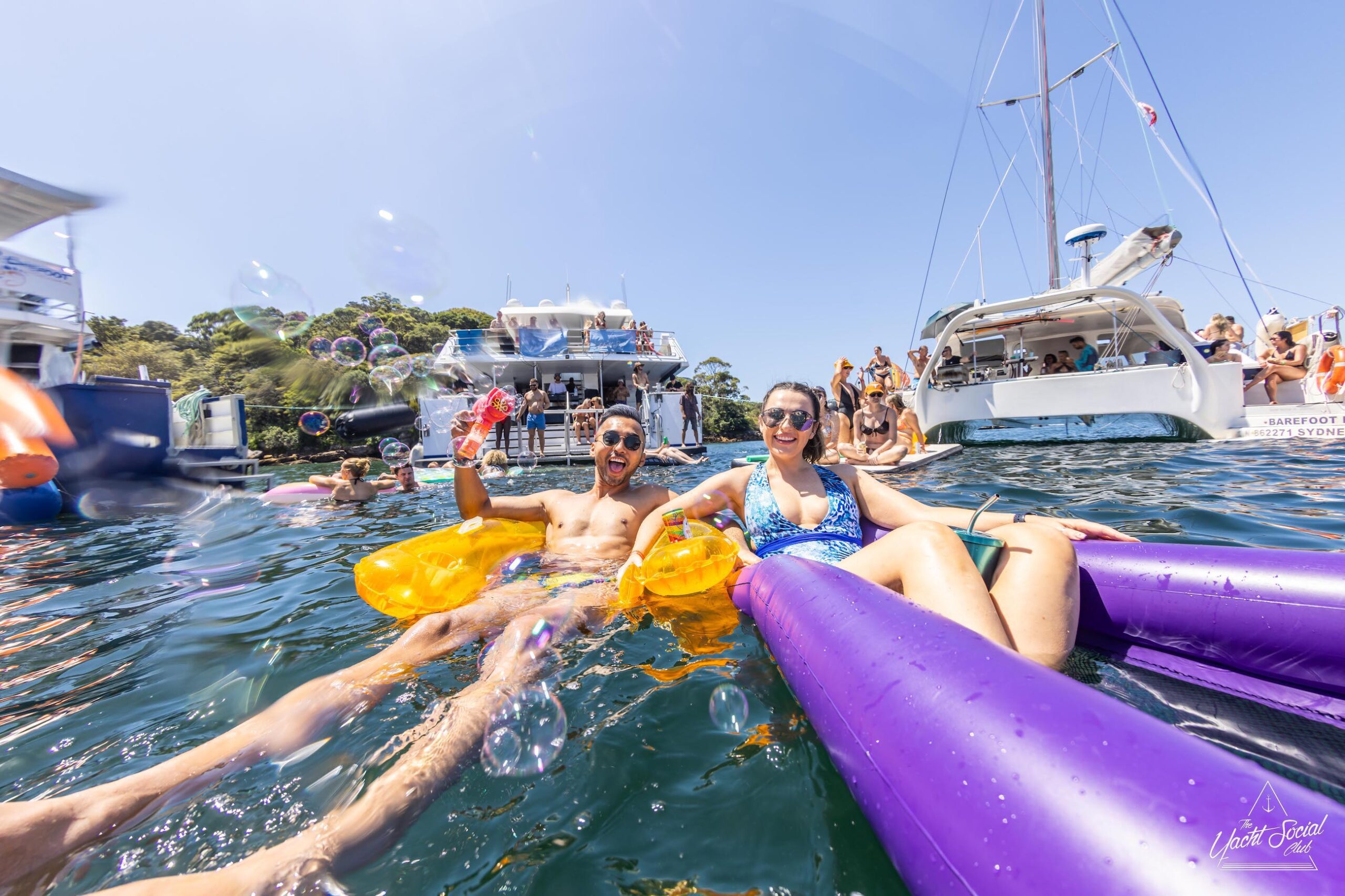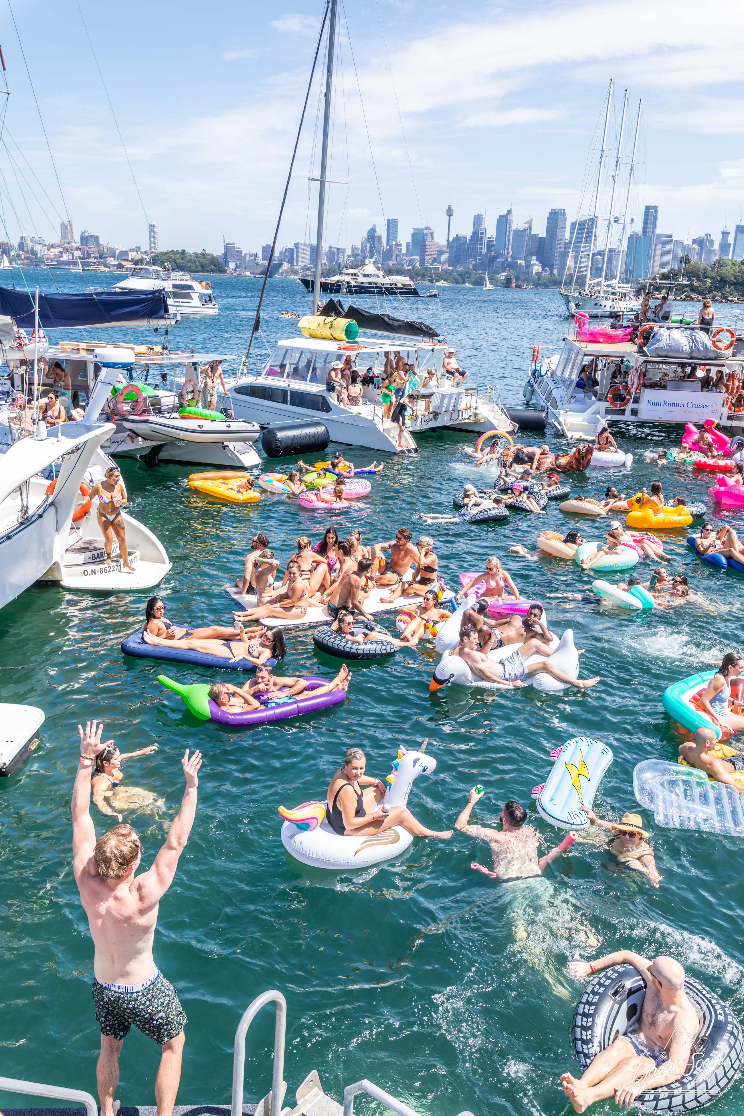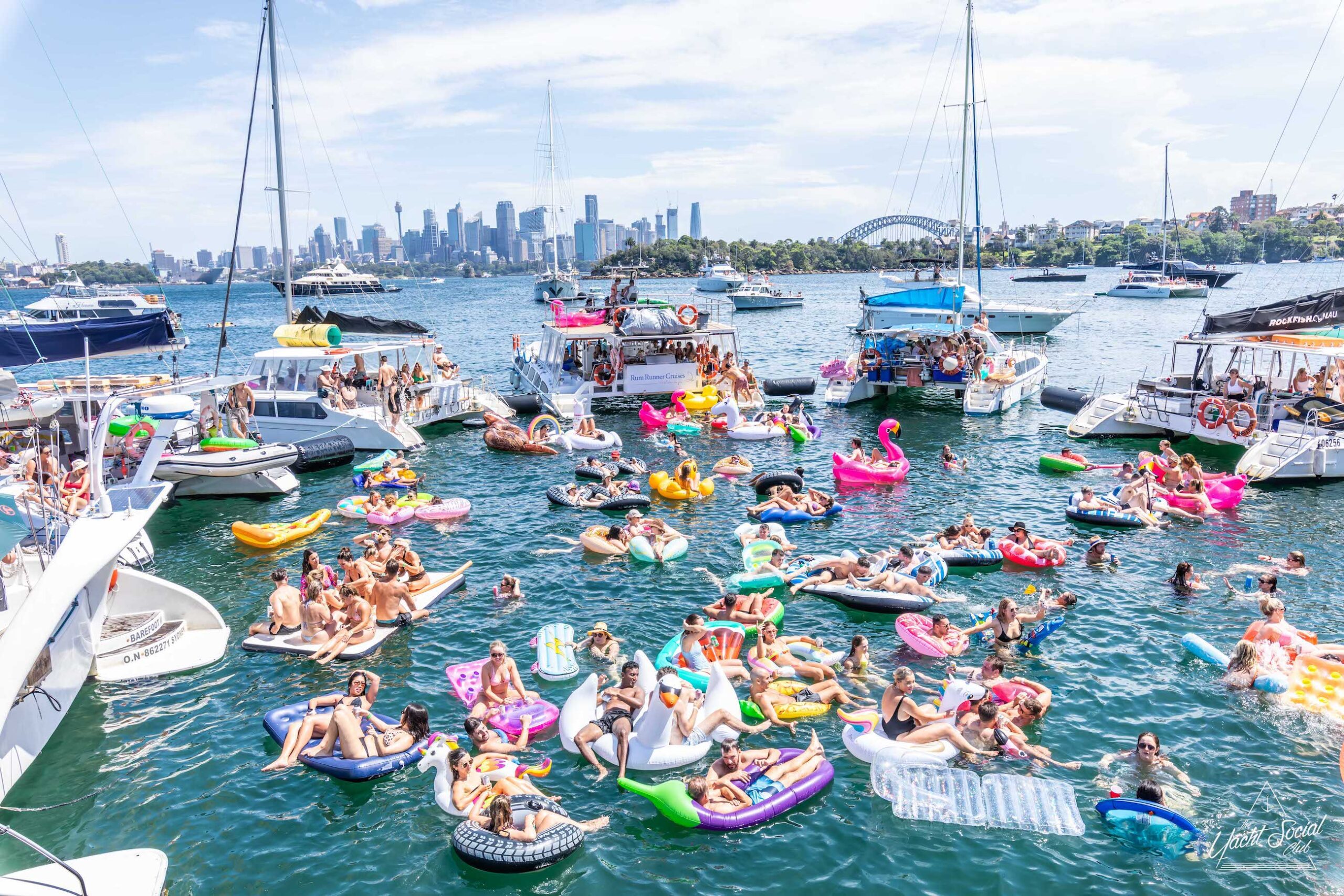 People floating on colorful inflatable pool toys in the water near several boats on a sunny day, enjoying a lively catamaran party in Sydney.