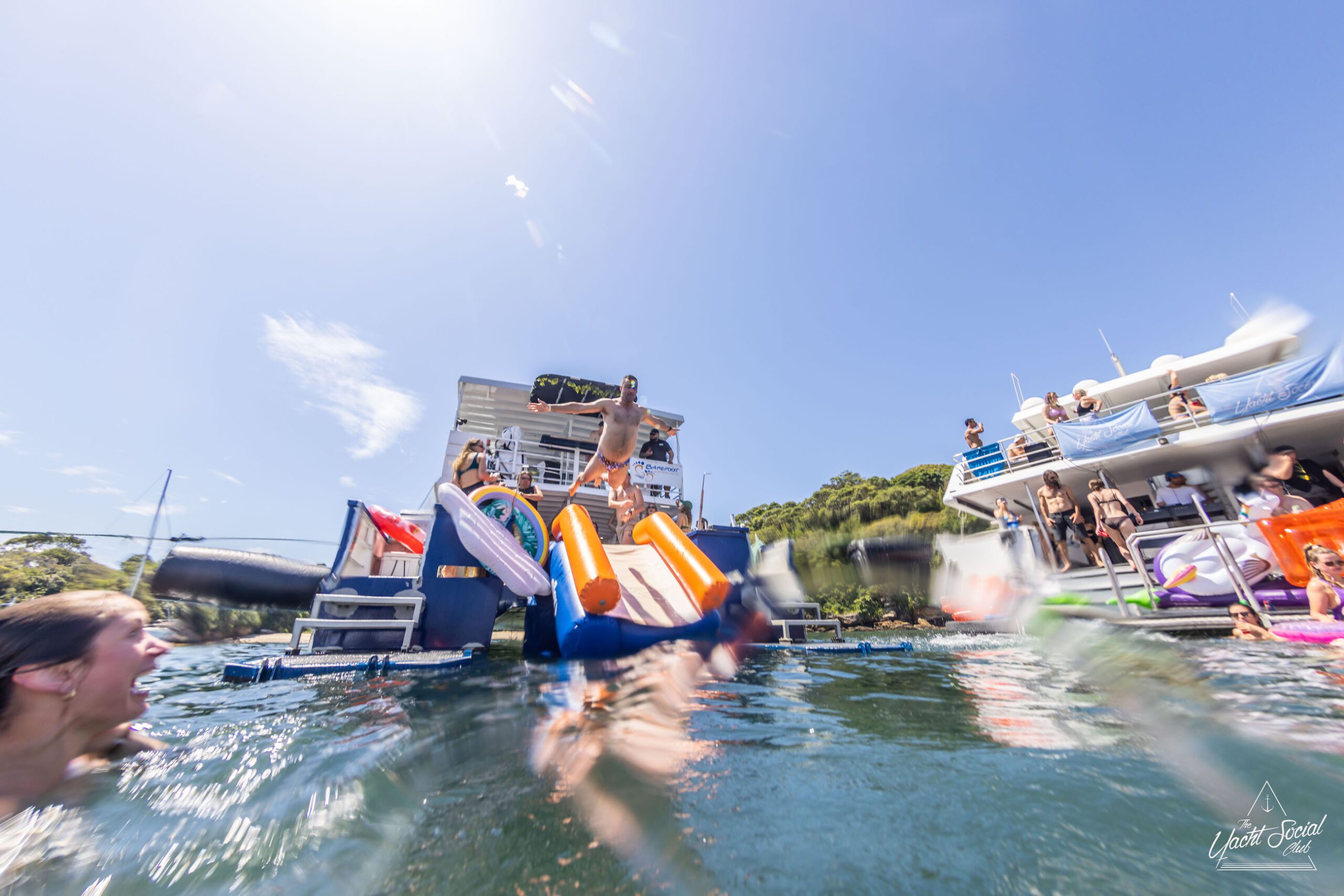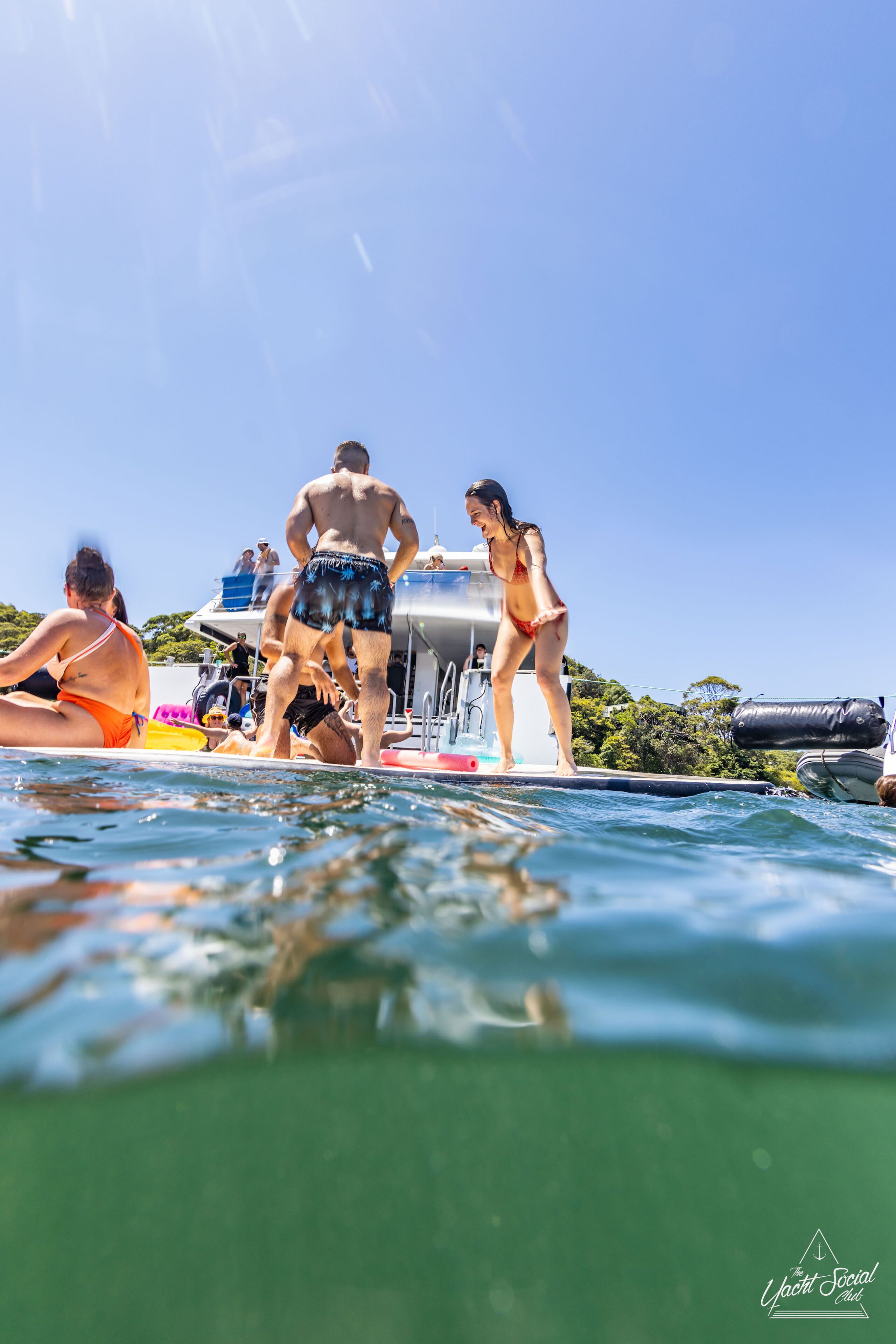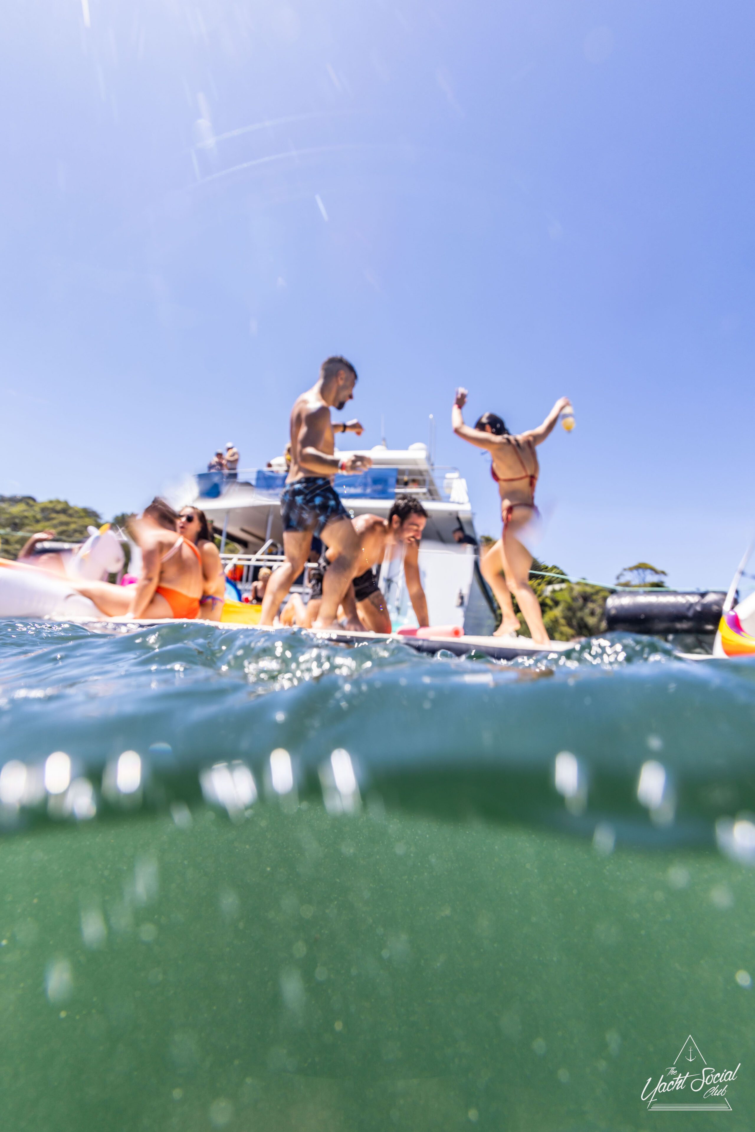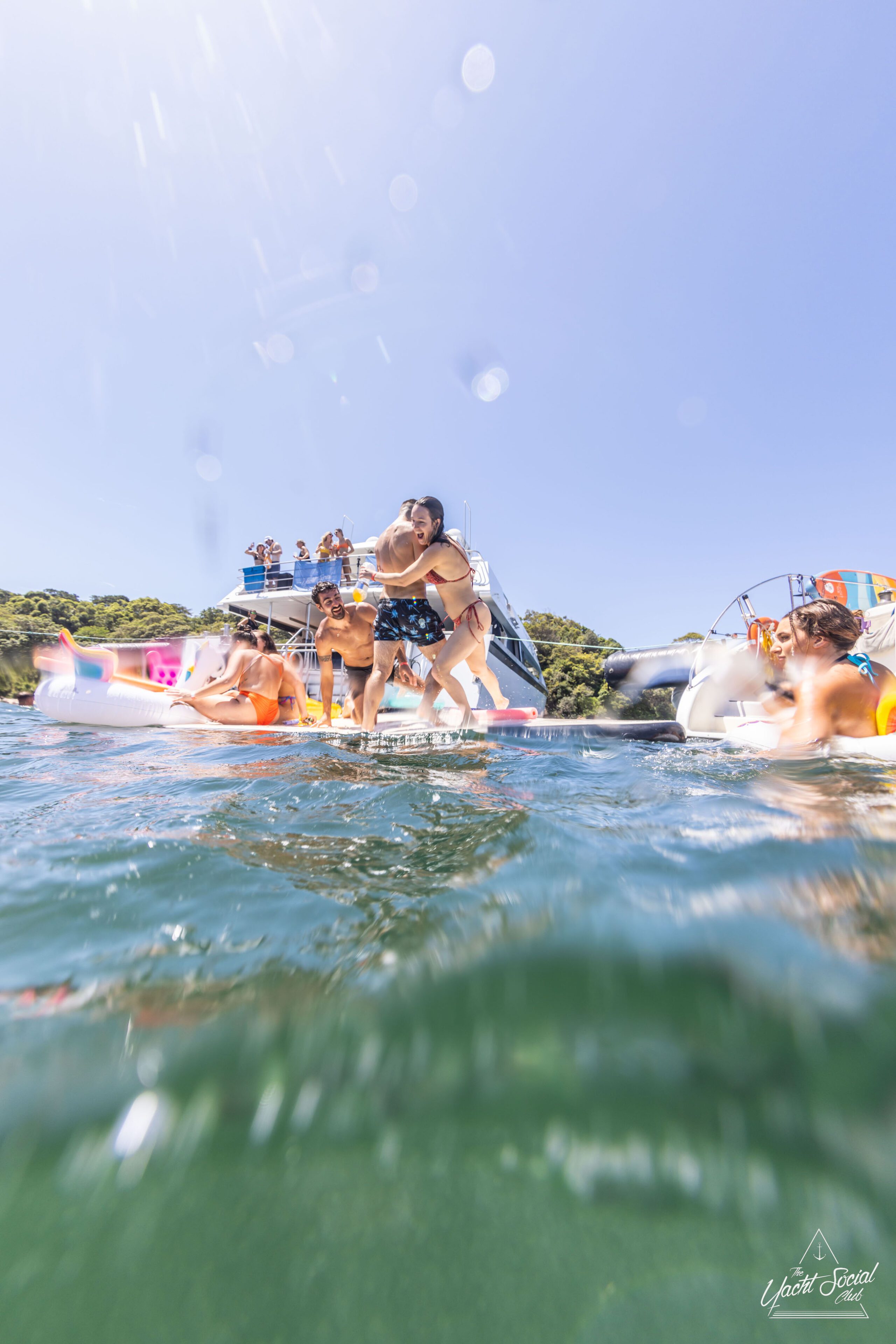 A group of people having a fun time swimming and jumping from a yacht on a sunny day, with the lower half of the image showing the water and the upper half showing part of the yacht and people enjoying a lively catamaran party in Sydney.
