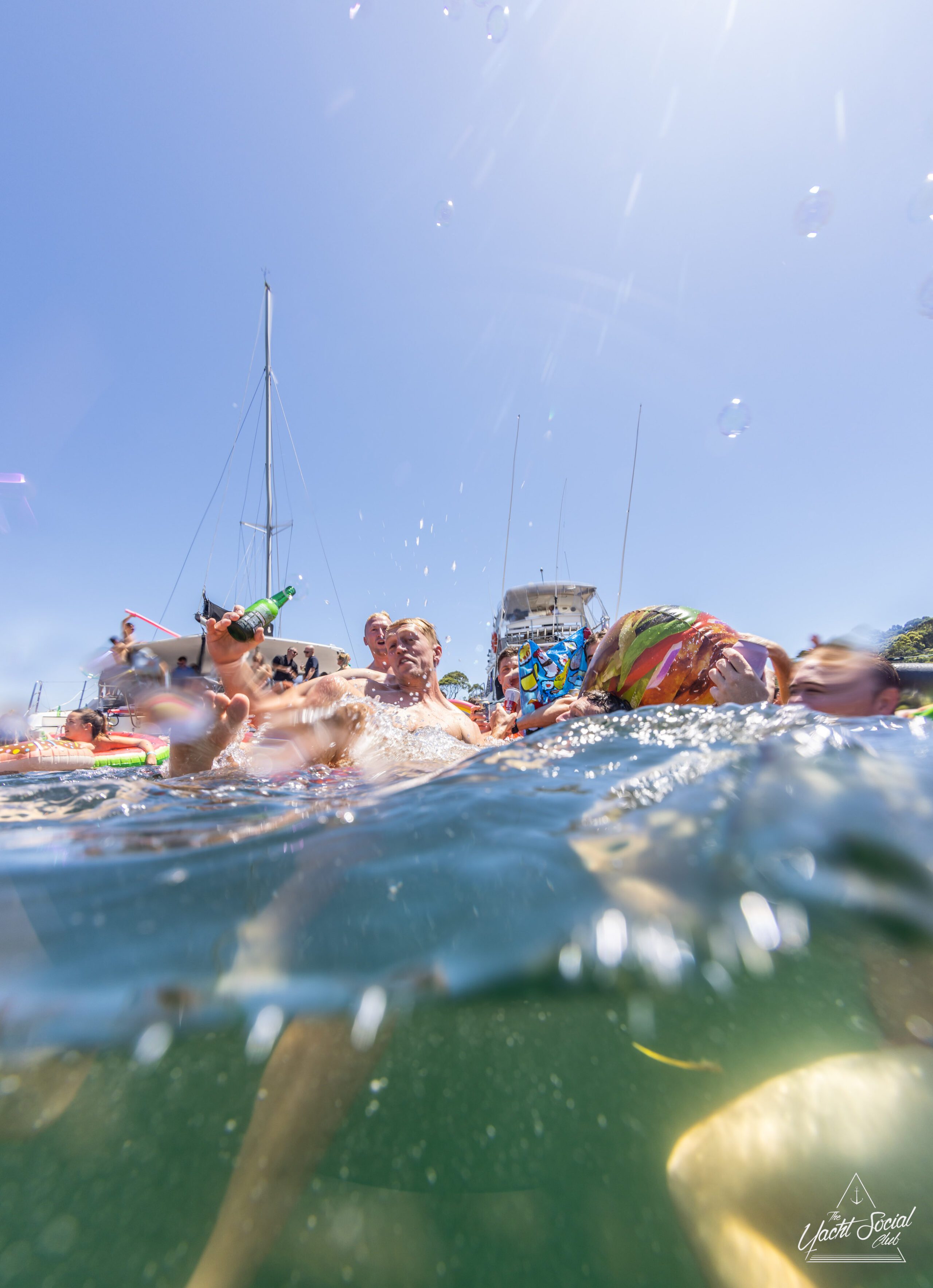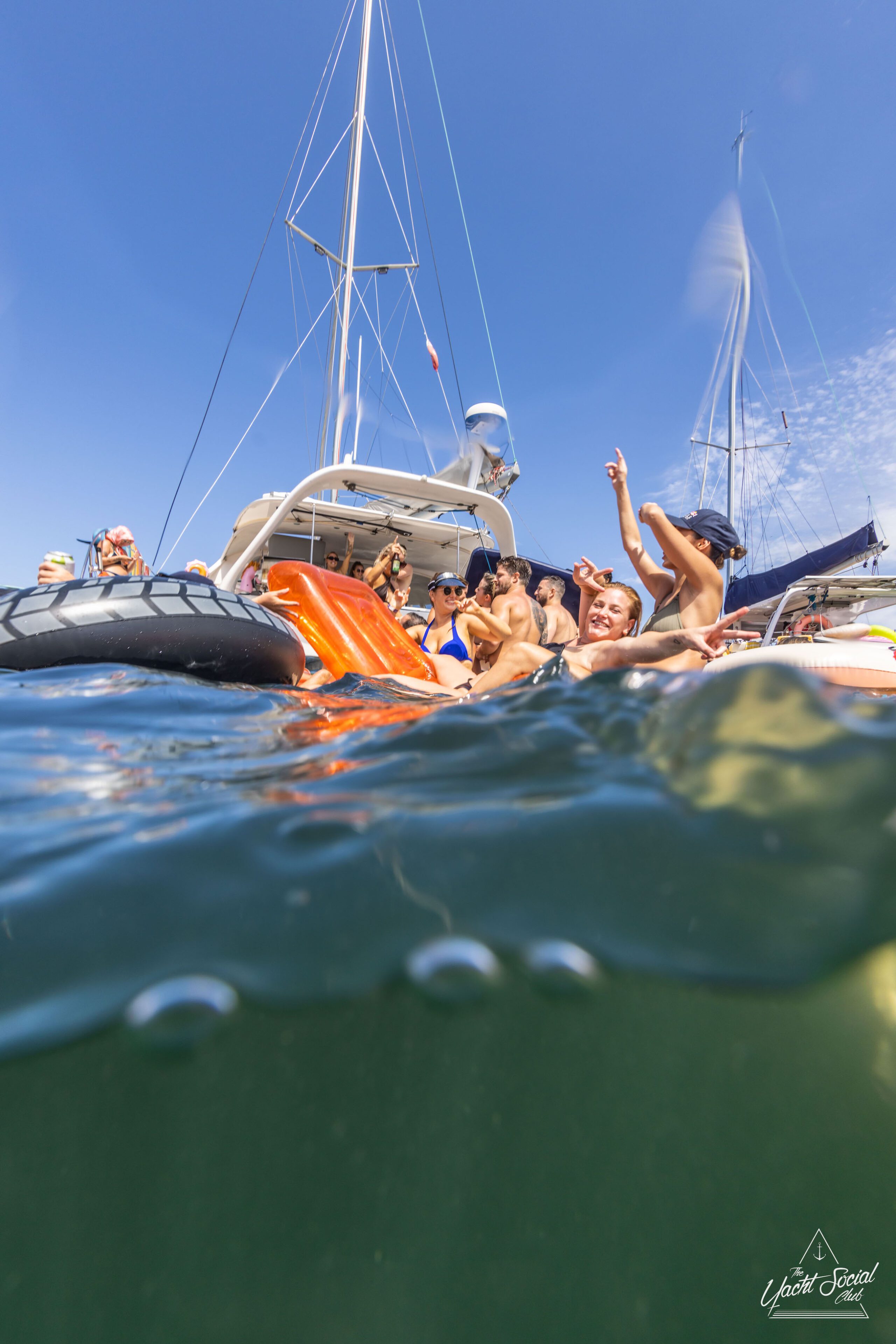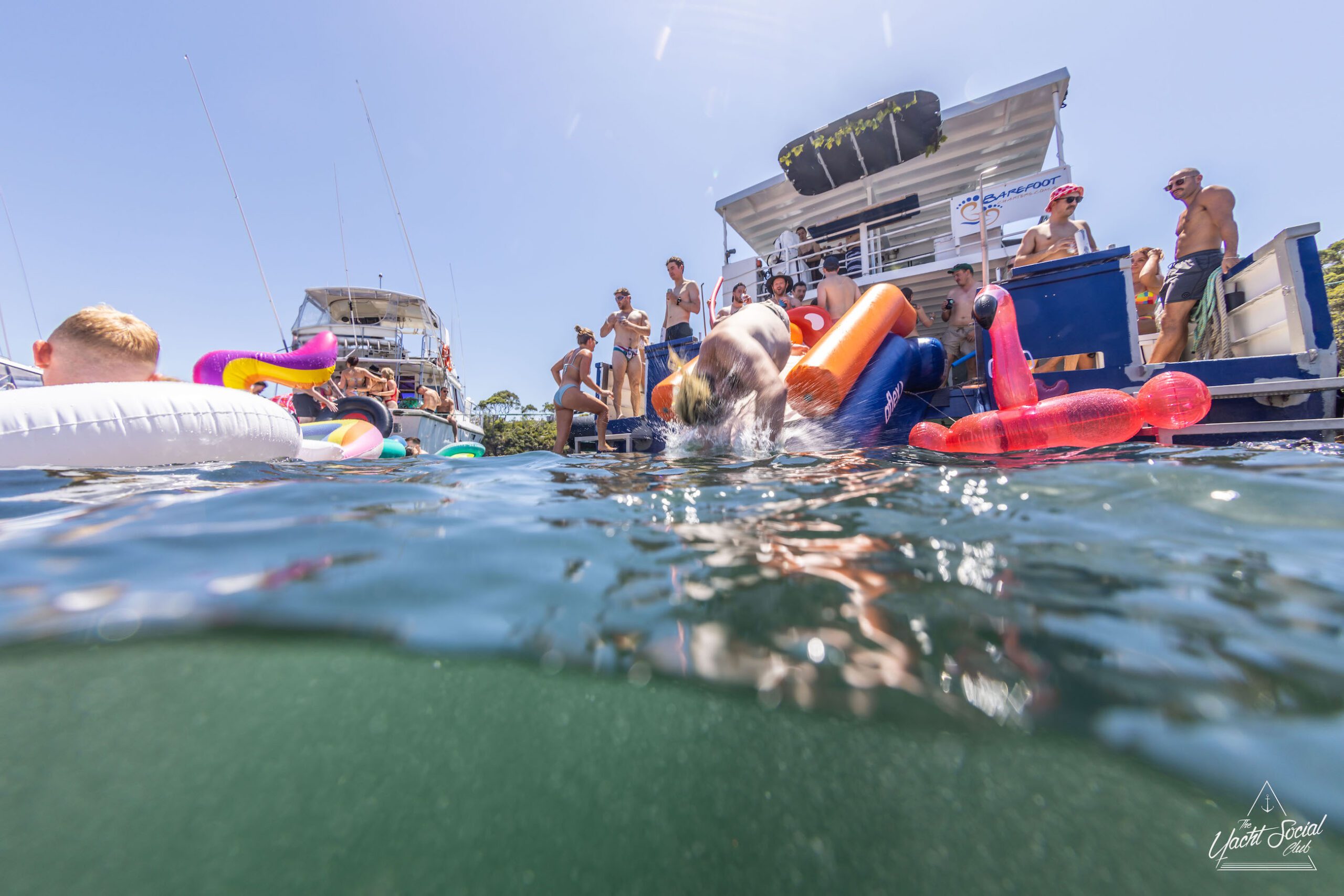 A group of people having a fun time swimming and jumping from a yacht on a sunny day, with the lower half of the image showing the water and the upper half showing part of the yacht and people enjoying a lively catamaran party in Sydney.