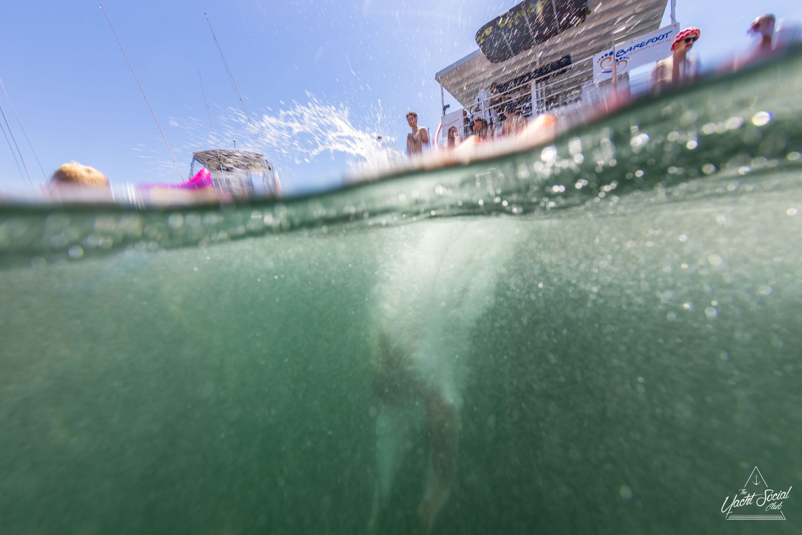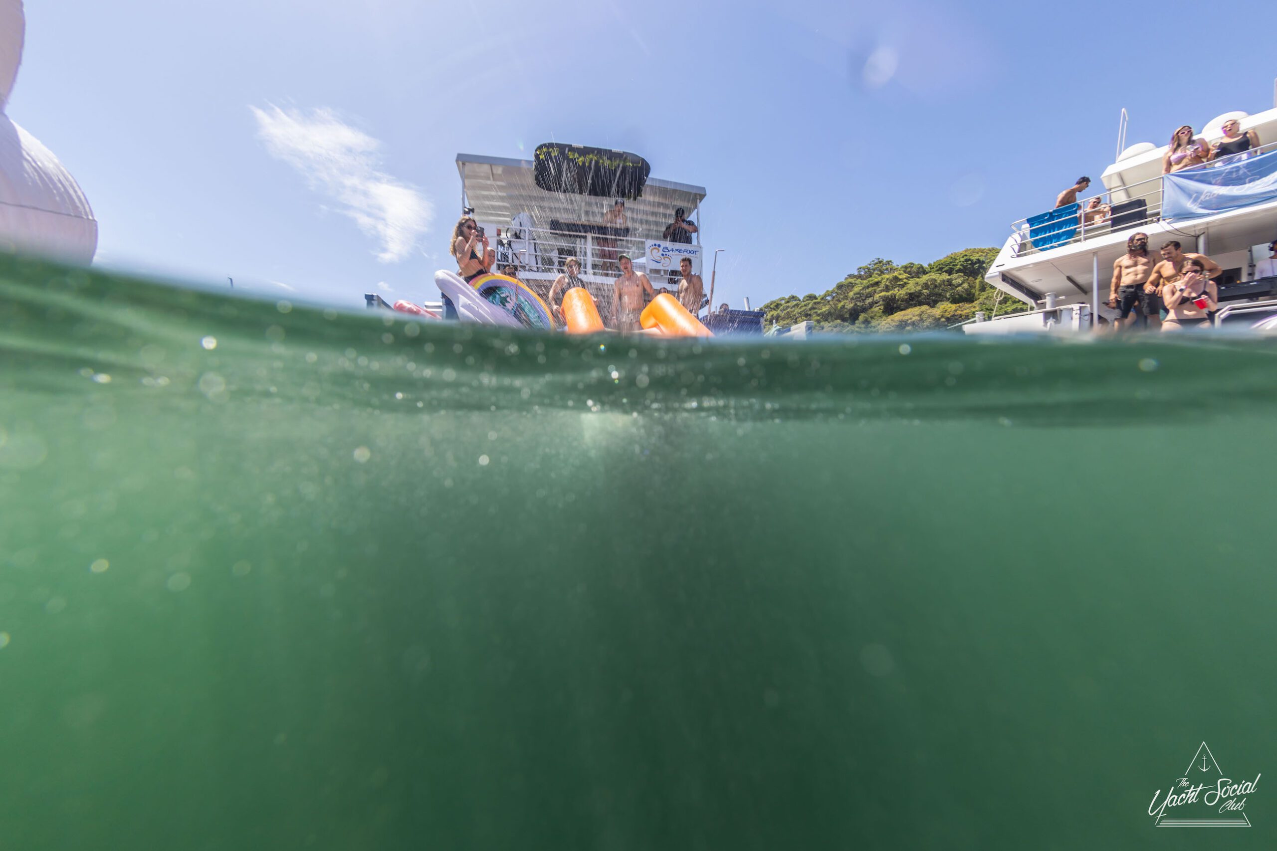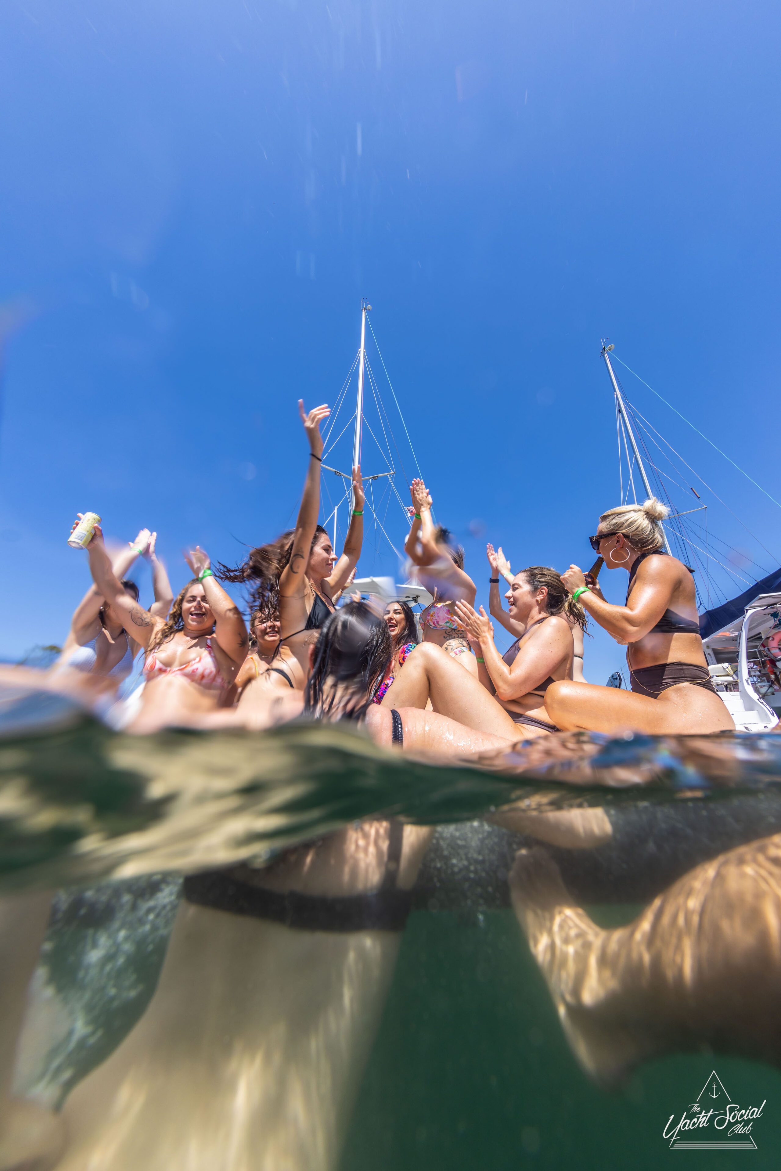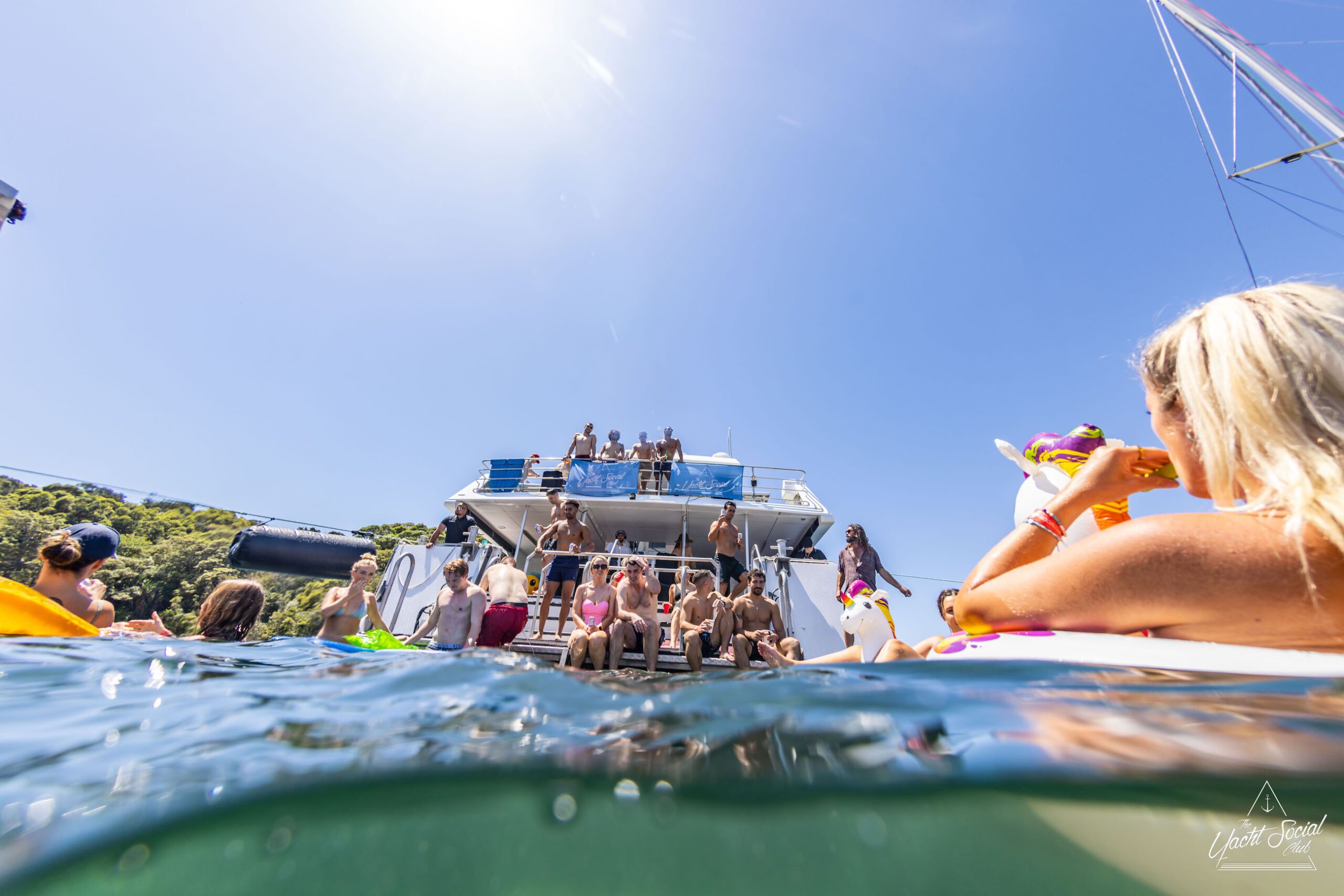 A group of people having a fun time swimming and jumping from a yacht on a sunny day, with the lower half of the image showing the water and the upper half showing part of the yacht and people enjoying a lively catamaran party in Sydney.