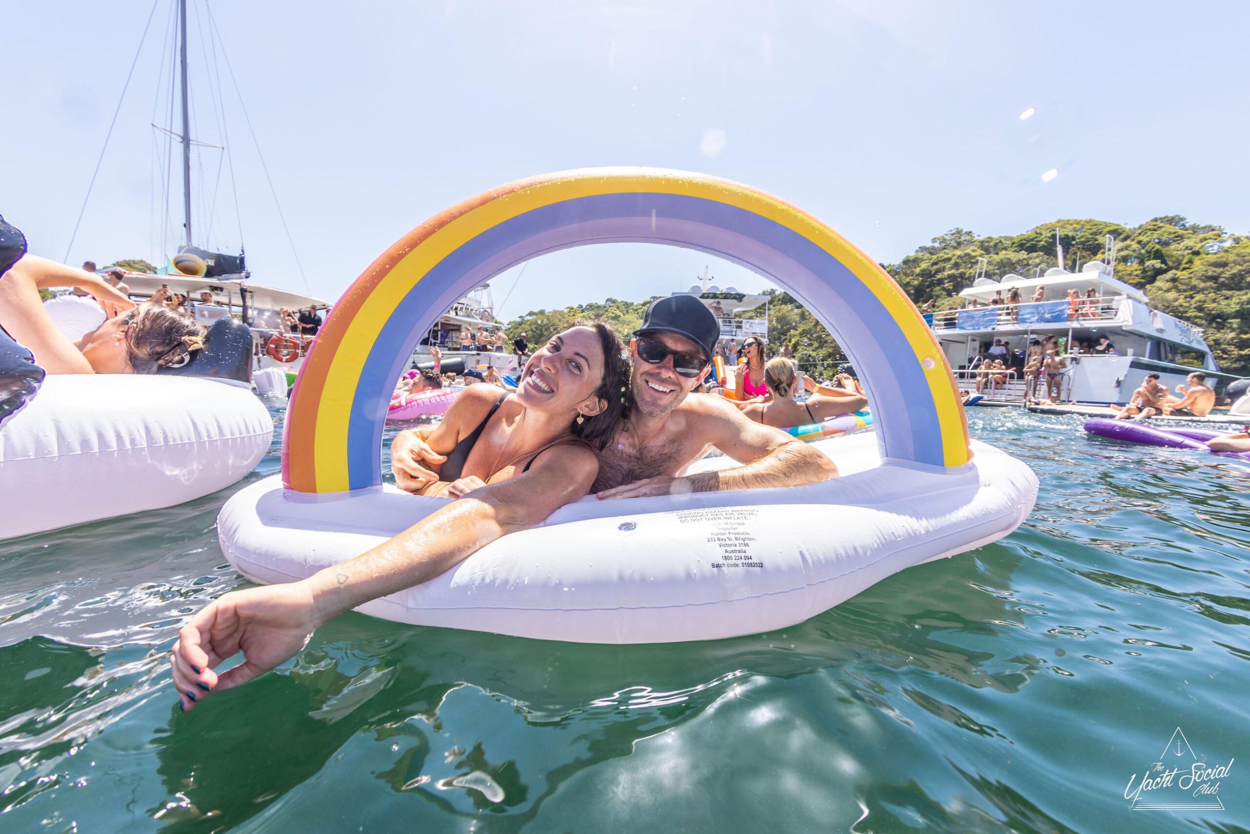 A man and woman are lying on an inflatable rainbow float in the water, surrounded by other people and boats in the background. The scene appears playful and sunny, perfect for enjoying a luxury yacht hire Sydney experience.