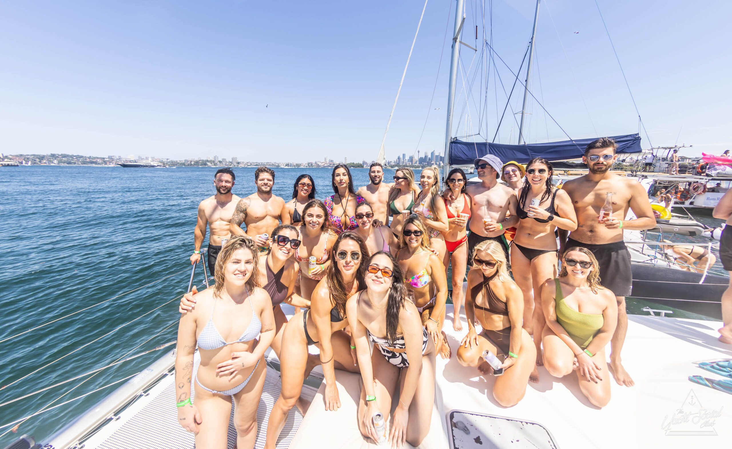 Group of women in swimsuits standing on a boat in a sunny harbor with other people nearby, enjoying a catamaran party Sydney style.