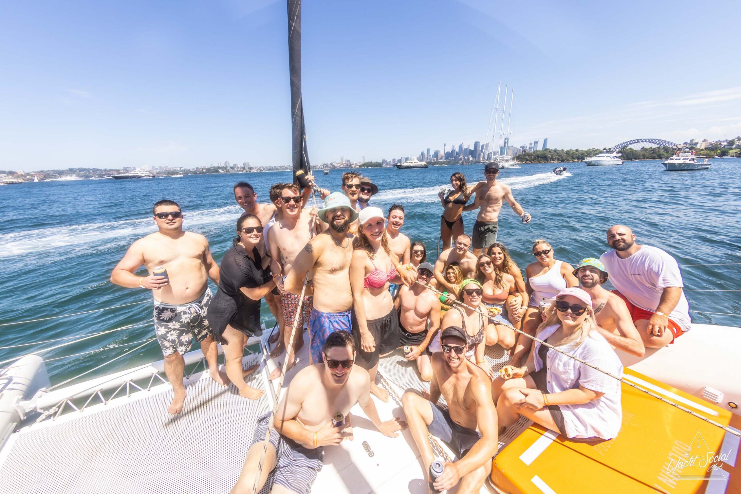 A large group of people in swimwear pose for a photo on a private yacht charter Sydney Harbour, with a city skyline visible in the background.