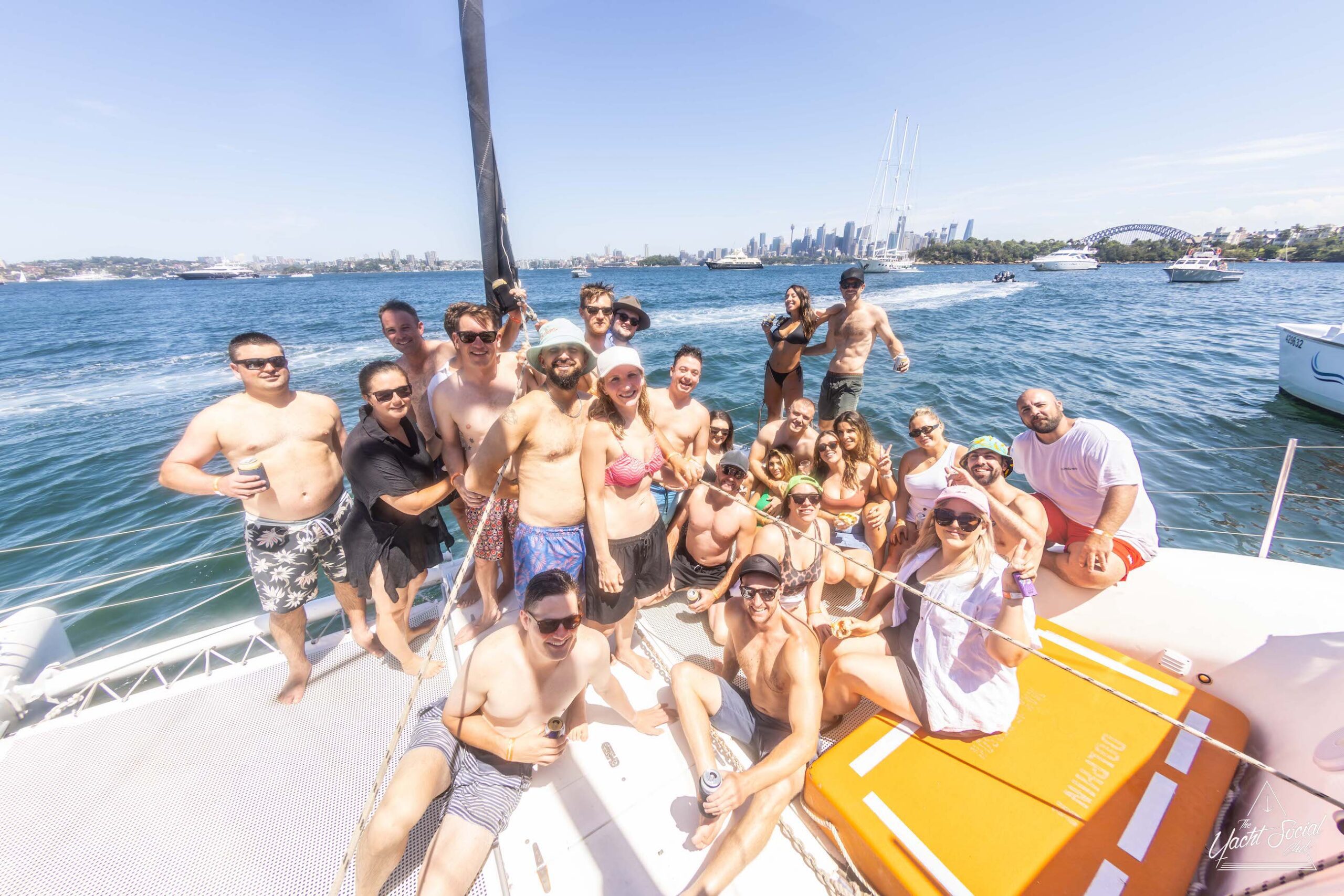 A group of people enjoying a sunny day on a catamaran party in Sydney, with some on inflatable toys in the water and others on the boat's deck.