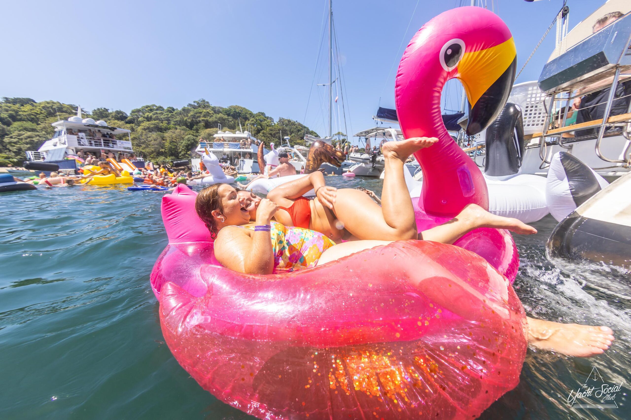 Two people relax on a pink flamingo inflatable in a sunny, crowded body of water with boats and other inflatables around them, setting the perfect scene for luxury yacht hire Sydney.