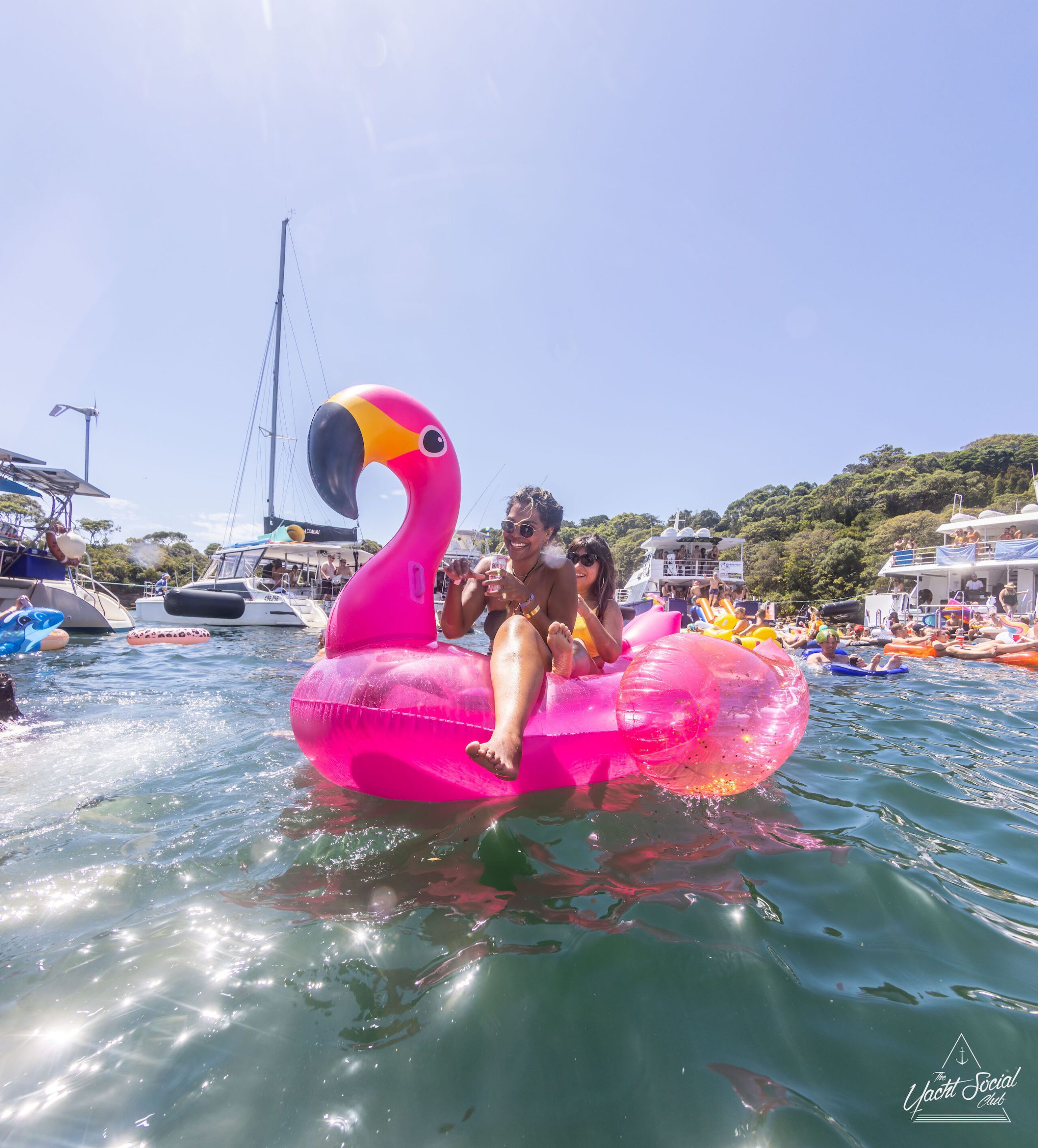 Two people are floating on an inflatable pink flamingo in a scenic water area with boats and other inflatables nearby. Both are waving and appear to be enjoying the moment, while a stunning private yacht charter cruises by in Sydney Harbour.