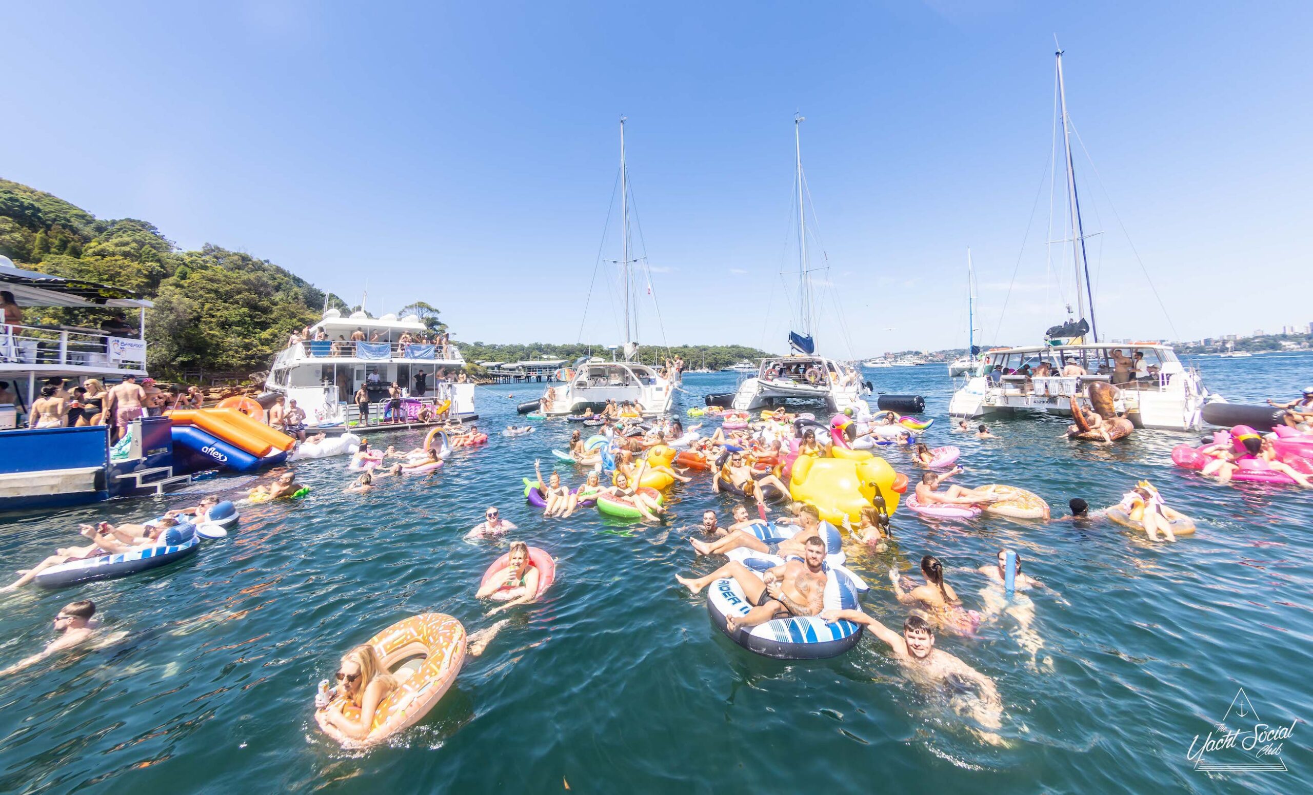 People swimming and lounging on inflatable floats in a crowded water area surrounded by boats on a sunny day, enjoying the atmosphere of a private yacht charter in Sydney Harbour.