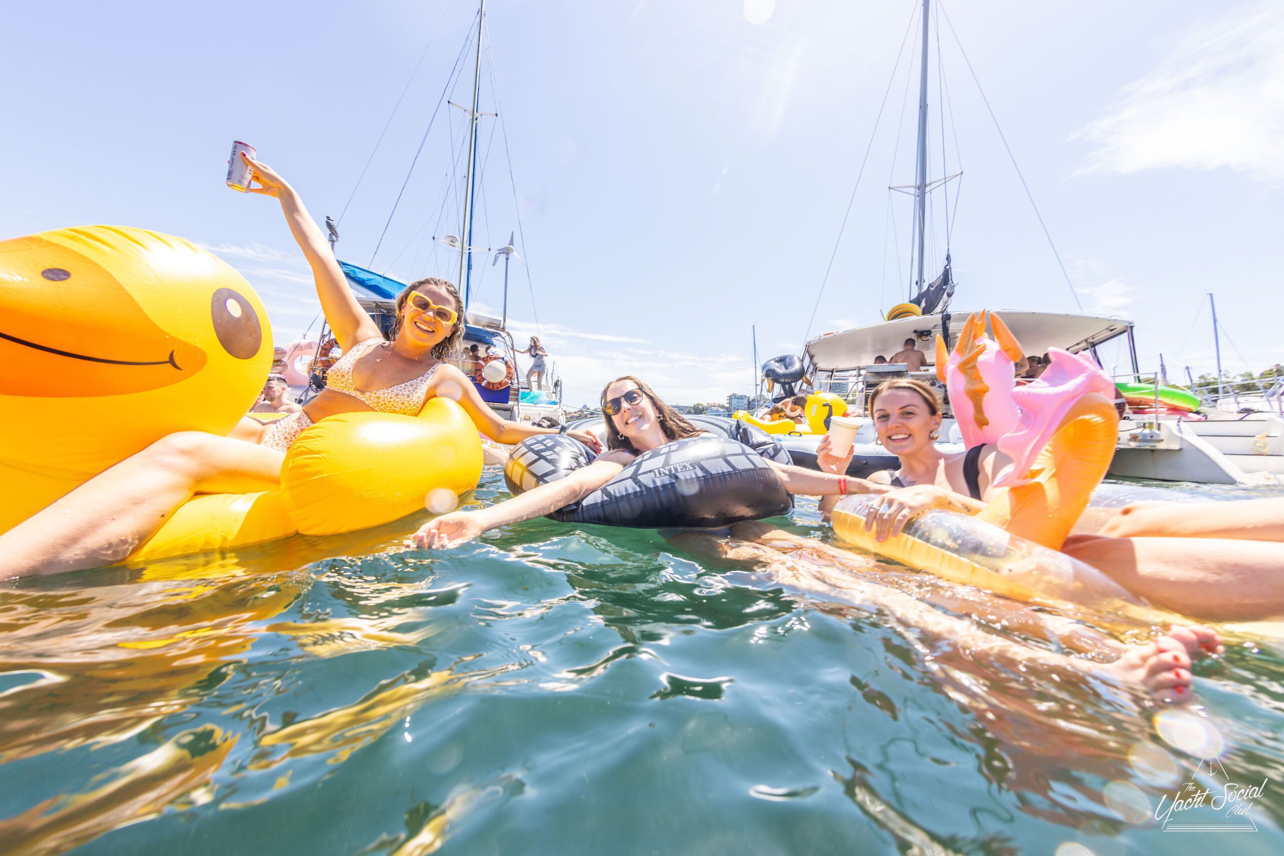 Three people on inflatable pool floats enjoy a sunny day on the water, surrounded by boats, as part of a lively Sydney boat party hire event.