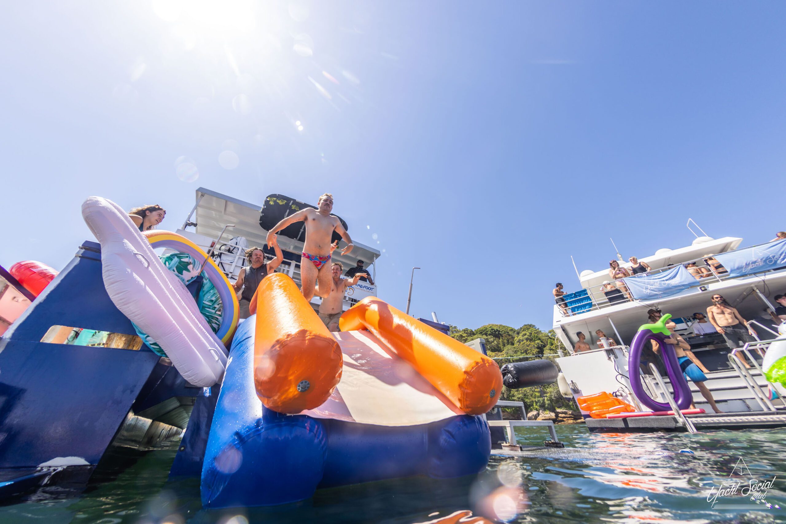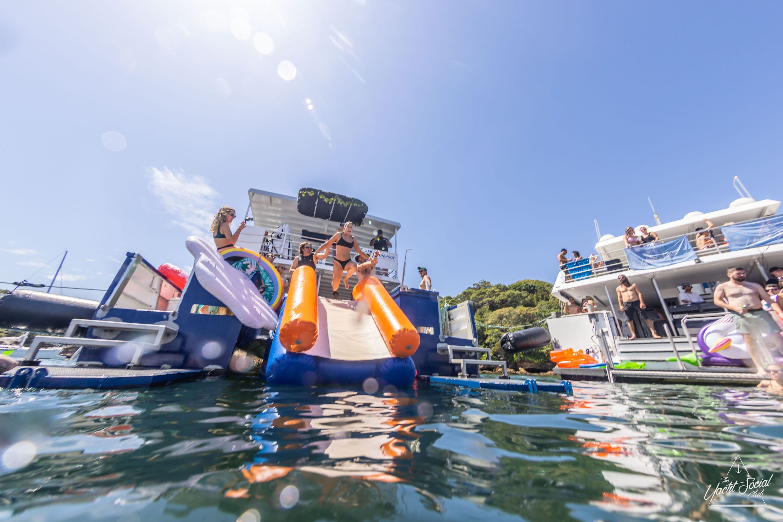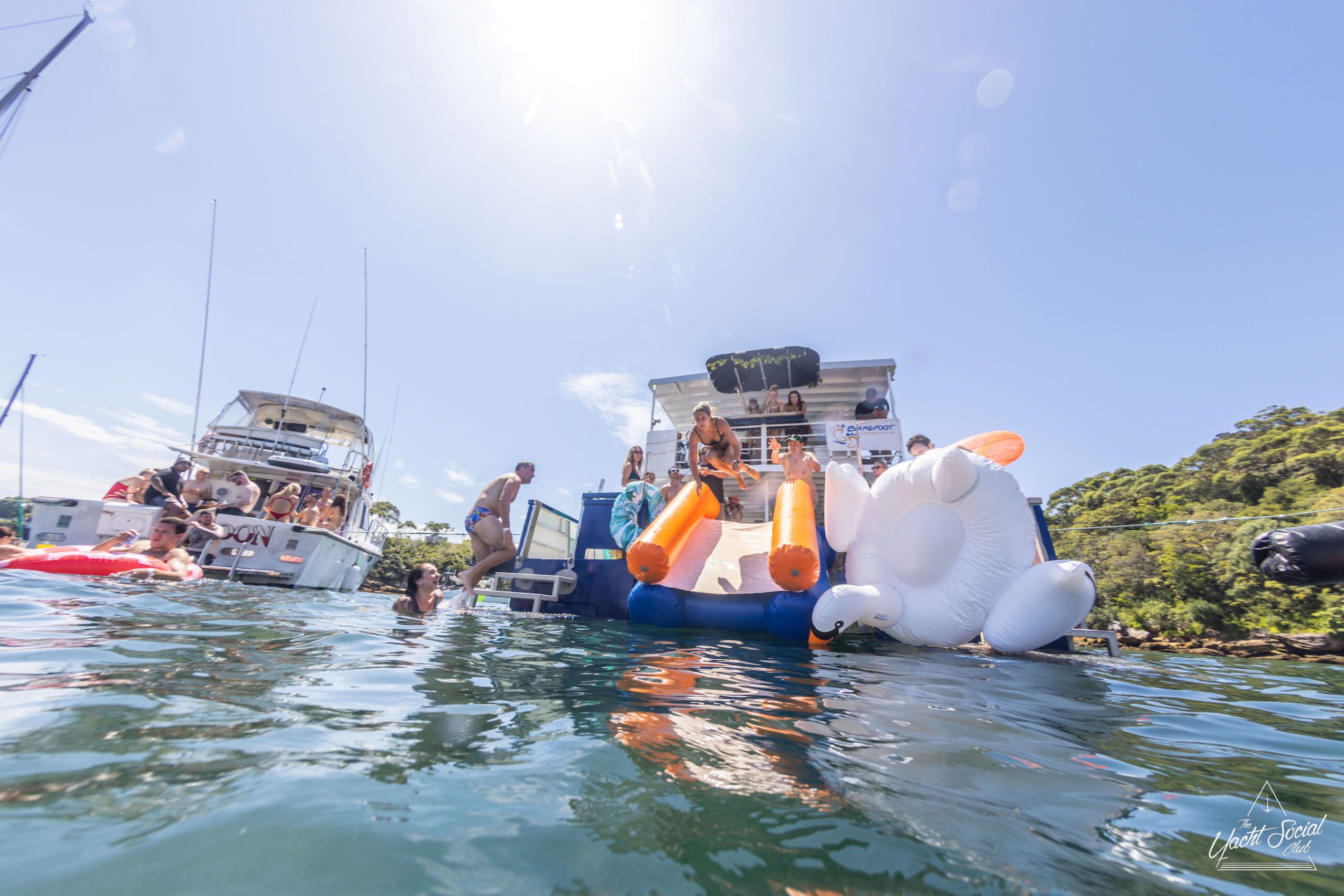 Enjoy a sunny day on the water with people lounging on inflatables, surrounded by anchored boats. Experience the excitement of DJ boat hire in Sydney, where vibrant music sets the perfect backdrop for fun and relaxation.