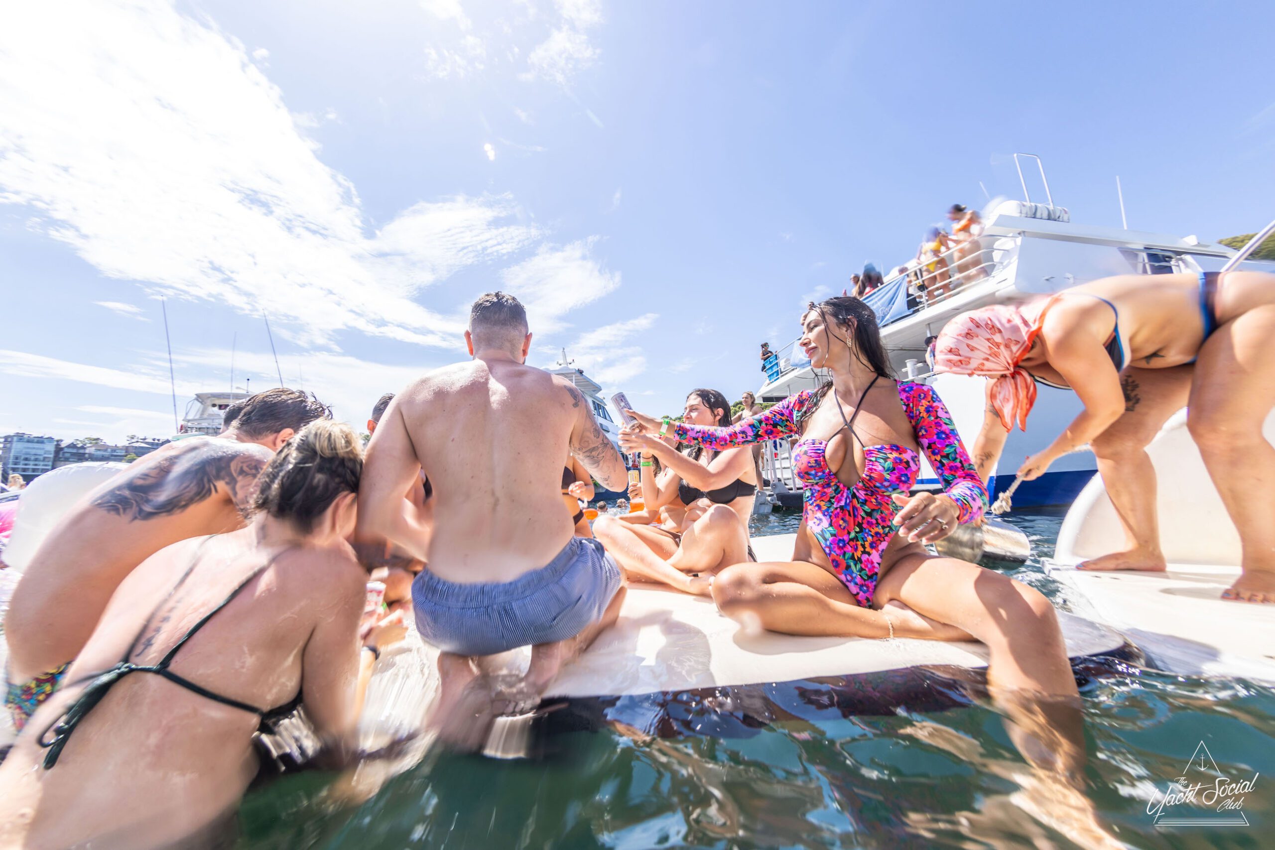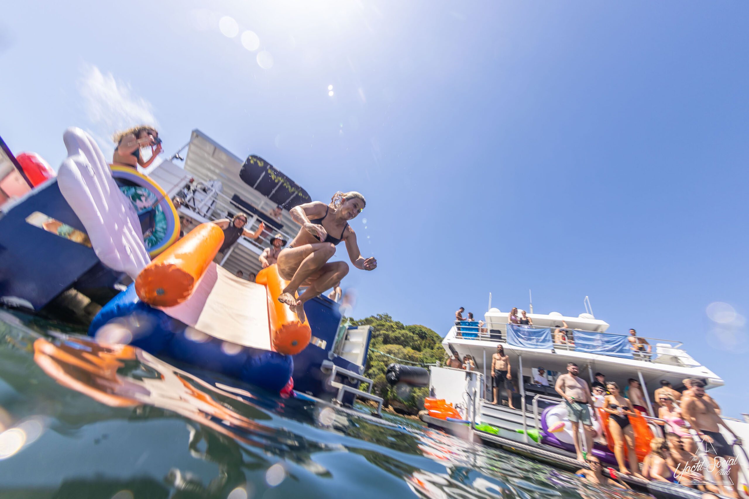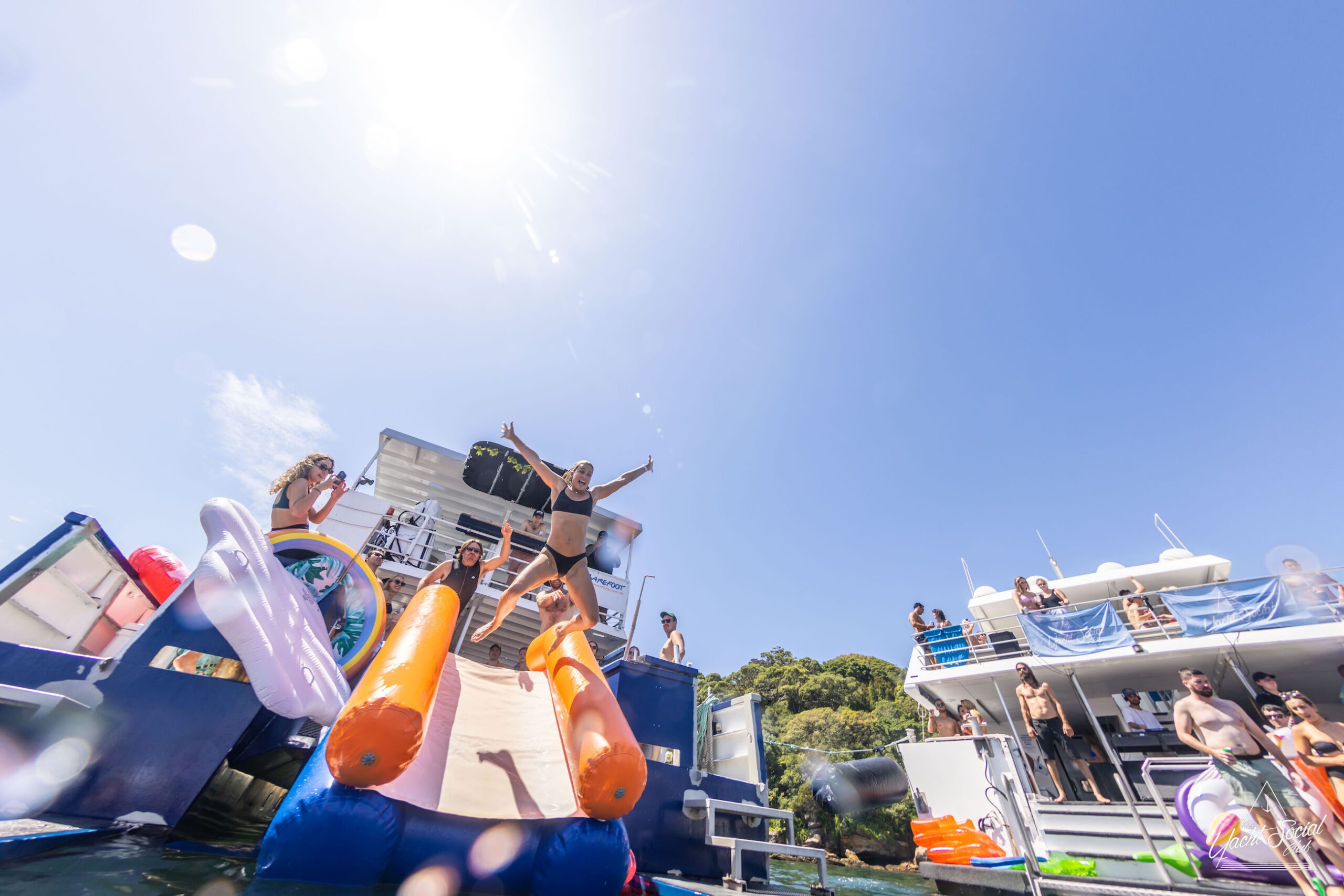 Enjoy a sunny day on the water with people lounging on inflatables, surrounded by anchored boats. Experience the excitement of DJ boat hire in Sydney, where vibrant music sets the perfect backdrop for fun and relaxation.