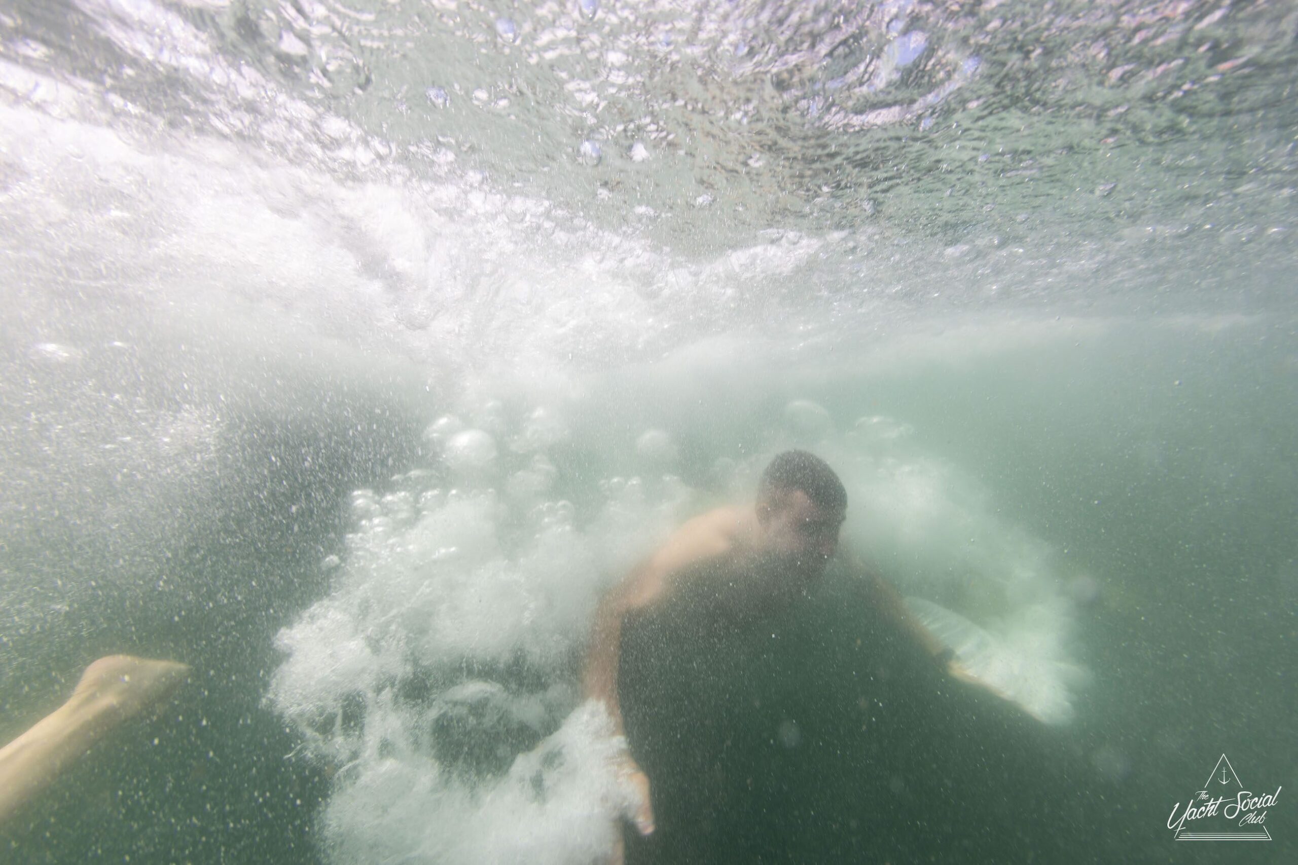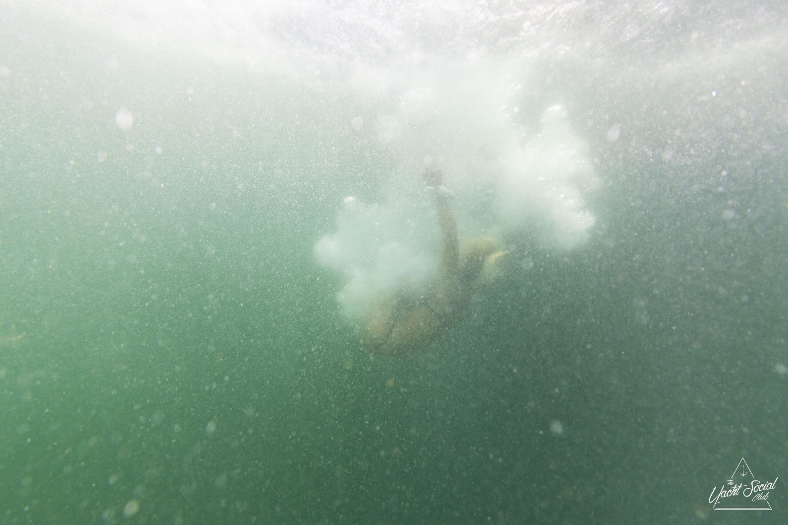 Underwater view of a person entering the water while people on a boat in the background watch. Splashes can be seen above the water surface at this lively Sydney boat party hire.