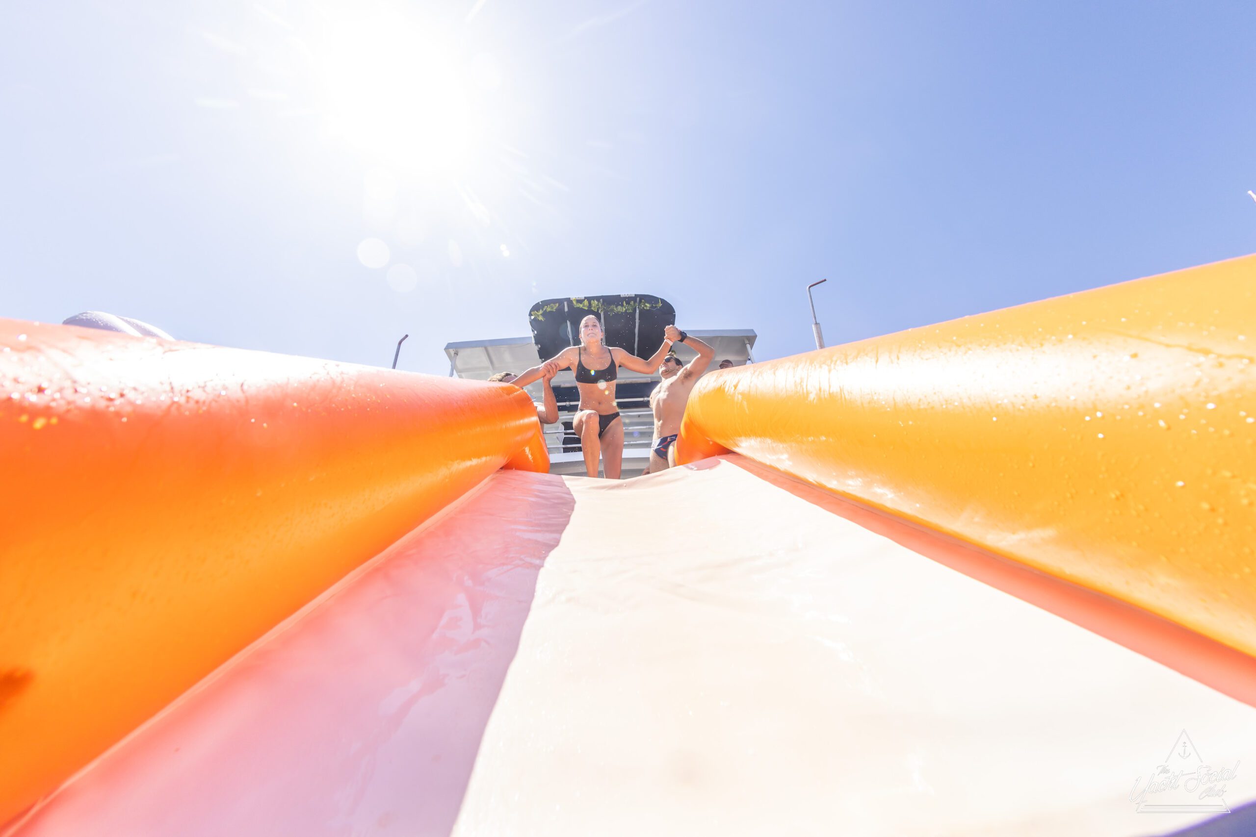 People on orange inflatable lounge chairs enjoying a catamaran party in the water surrounded by boats and other floatation devices. The event is characterized by a lively atmosphere under clear skies.