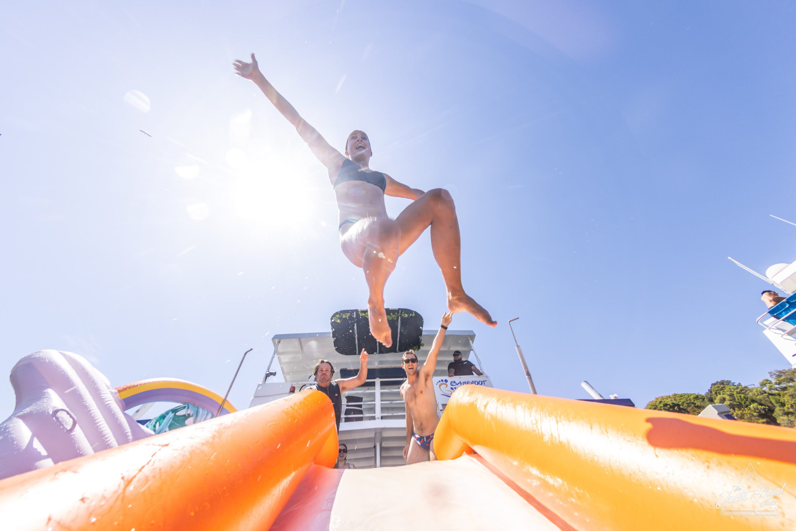 People enjoying a sunny day on an inflatable float at a pool party, surrounded by colorful floats and boats in the background. It's the perfect scene for a Sydney boat party hire or DJ boat hire Sydney, making any corporate boat events in Sydney unforgettable.